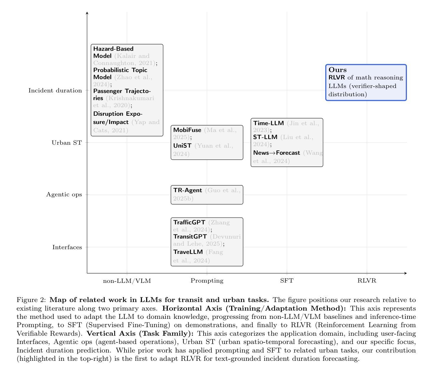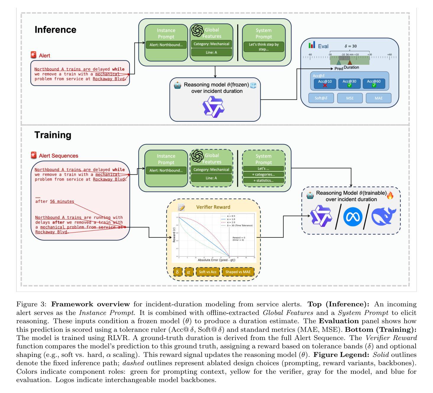 预测公共交通事件持续时间从非结构化文本警报是一项至关重要但具有挑战性的任务。使用标准监督微调(SFT)解决公共交通运营领域的稀疏性是很困难的,因为这项任务涉及带有噪声的连续标签,并且缺乏可靠的专家演示来进行推理。尽管强化学习从可验证奖励(RLVR)在数学等具有二元正确性的任务上表现出色,但其在噪声大、连续性预测方面的适用性尚待解答。据我们所知,这项工作首次架起了RLVR大型语言模型训练和公共交通运营中关键现实预测挑战之间的桥梁。我们通过引入基于容忍度的奖励函数来适应RLVR进行这项任务,在连续的误差范围内授予部分信用,而不是要求单一的正确答案。我们在纽约市MTA服务警报编辑的数据集上系统地评估了这一框架。我们的研究结果表明,通用指令调优的大型语言模型显著优于专业数学推理模型,后者在处理模糊现实文本时遇到麻烦。我们通过实证证明了二元奖励是不稳定的并且会降低性能,而我们的形状奖励设计是关键的,使我们的模型在最具挑战性的指标上占据主导地位。虽然经典回归器在最小化总体MAE或MSE方面更优越,但我们的RLVR方法在最准确的五分钟指标(Acc@5)上相对于最强的基线实现了35%的相对改进。这表明RLVR可以成功适应现实世界的噪声预测,但需要反映问题连续性的验证器设计。
