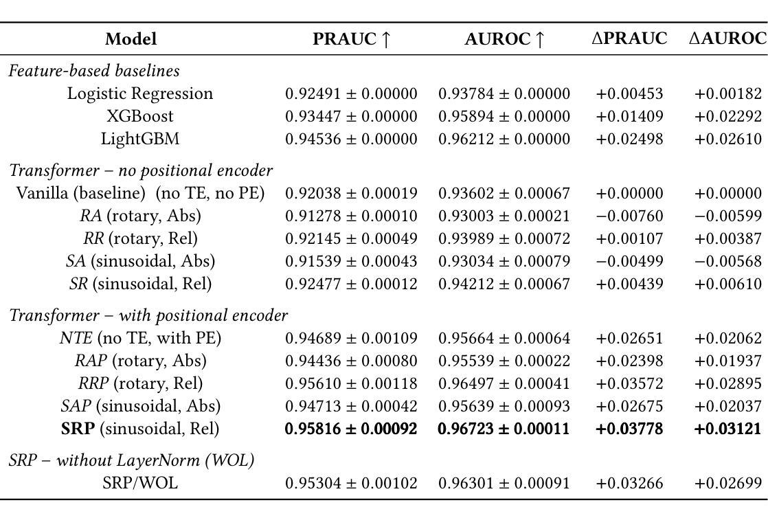 在真实世界的银行流水交易中检测支付欺诈,需要能够利用事件顺序和事件之间不规则时间间隔的模型。我们引入了FraudTransformer,这是一个序列模型,它增加了基本的GPT风格架构,其中包括(i)专用时间编码器,可以嵌入绝对时间戳或事件间值,(ii)学习位置编码器,可以保留相对顺序。在大型工业数据集上的实验——数千万笔交易和辅助事件——表明,FraudTransformer超越了四个强大的经典基线(Logistic回归、XGBoost和LightGBM),以及省略了时间或位置组件的变压器消融模型。在保留的测试集上,它达到了最高的AUROC和PRAUC。