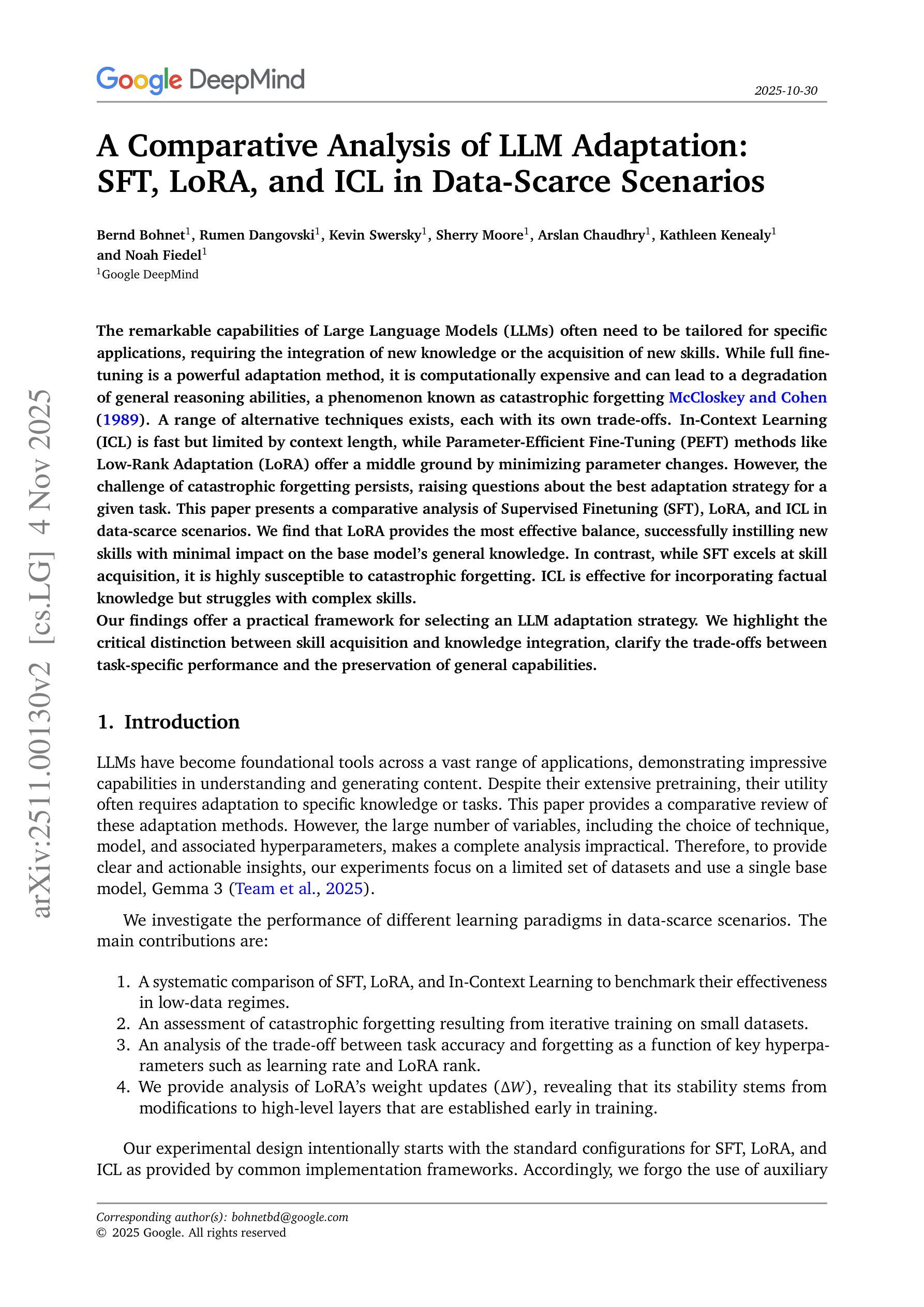 大型语言模型(LLM)的显著能力通常需要针对特定应用进行定制,这需要整合新知识或获取新技能。虽然完全微调是一种强大的适应方法,但它的计算成本高昂,并可能导致一般推理能力的下降,这种现象被称为灾难性遗忘。存在一系列替代技术,每种技术都有其自身的权衡。上下文学习(ICL)虽然快速,但受限于上下文长度,而参数高效微调(PEFT)方法如低秩适应(LoRA)则通过最小化参数变化提供了中间地带。然而,灾难性遗忘的挑战仍然存在,这引发了关于给定任务的最佳适应策略的问题。本文对数据稀缺场景下的监督微调(SFT)、LoRA和ICL进行了比较分析。我们发现LoRA提供了最有效的平衡,在成功灌输新技能的同时,对基础模型的一般知识影响最小。相比之下,虽然SFT在技能获取方面表现出色,但它很容易受到灾难性遗忘的影响。ICL在融入事实知识方面有效,但在处理复杂技能时却遇到困难。我们的发现提供了一个选择LLM适应策略的实际框架。我们强调了技能获取和知识整合之间的关键区别,澄清了特定任务性能和保留一般能力之间的权衡。