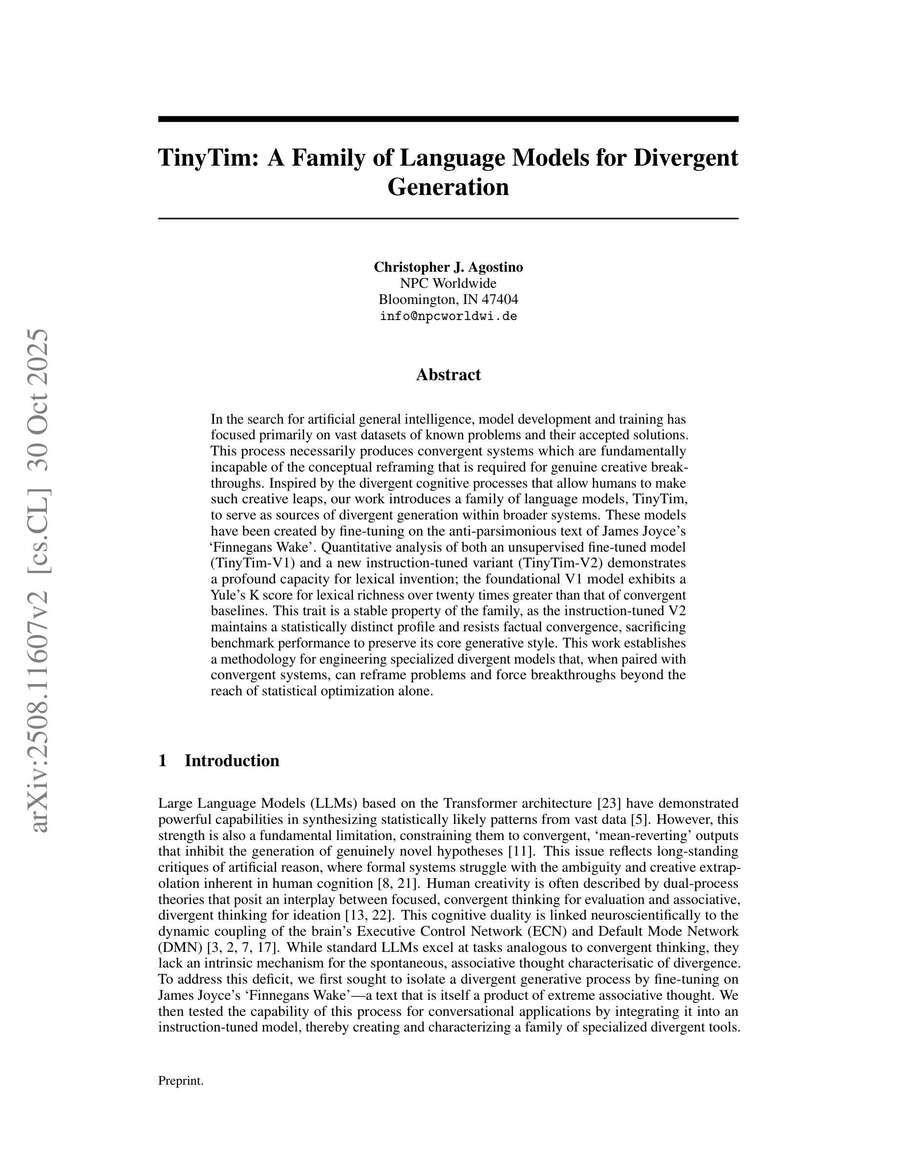 在寻找人工智能通用智能的过程中,模型开发和训练主要集中在已知问题的大量数据集及其接受的解决方案上。这一过程必然会产生收敛系统,而这些系统从根本上无法完成概念重构,无法进行真正的创造性突破。我们的工作受到人类能够实现如此跳跃的发散认知过程的启发,引入了一系列语言模型TinyTim,作为更广泛系统中发散生成的来源。这些模型通过微调詹姆斯·乔伊斯(James Joyce)的《芬尼根守灵夜》(Finnegans Wake)中的反简约文本而创建。对无监督微调模型(TinyTim-V1)和新指令调整变体(TinyTim-V2)的定量分析表明,它们在词汇发明方面具有深刻的能力;基础V1模型的词汇丰富度的尤尔K值(Yule’s K score)是收敛基准值的二十倍以上。这一特质是这个家族的一个稳定特征,因为指令调整后的V2保持了一个统计上独特的特征,抵制事实收敛,牺牲了基准性能以保留其核心生成风格。这项工作建立了一种工程化专业发散模型的方法论,当与收敛系统配对时,这种方法可以重构问题并迫使突破统计优化能力以外的进展。