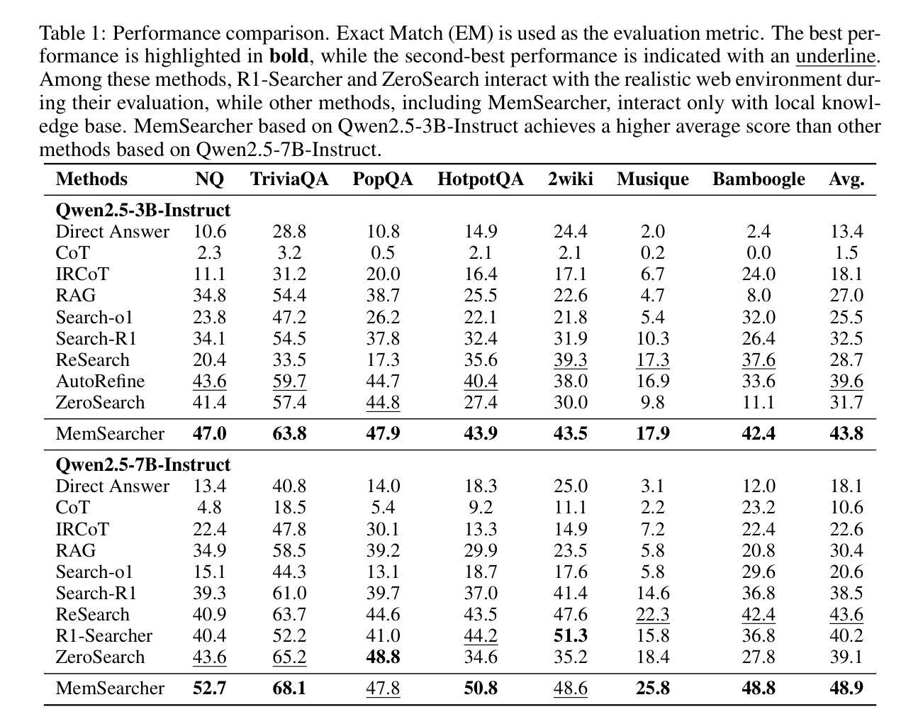 - MemSearcher在七个公共基准测试中取得了显著成果,相对平均增益达到+11%。