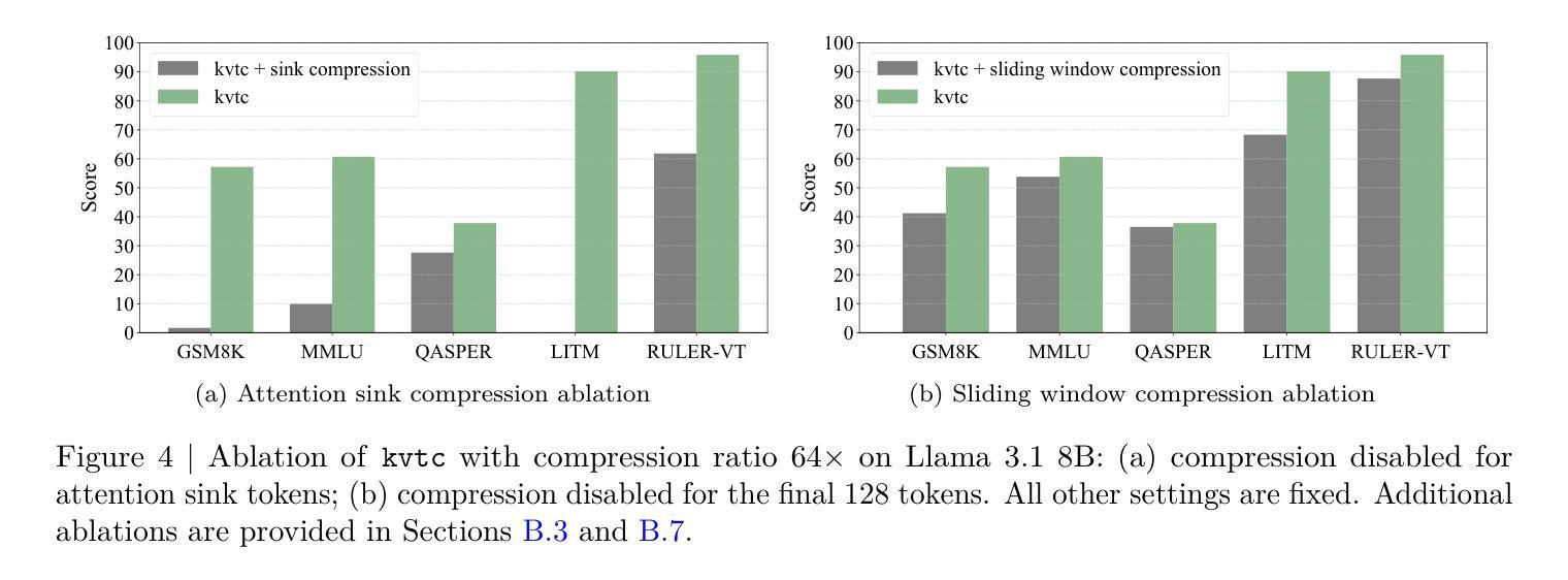 在大规模提供语言模型服务时,需要高效的键值缓存管理。通过共享前缀提示在对话回合之间重复使用键值缓存,这在迭代代码编辑和聊天中很常见。然而,过时的缓存消耗有限的GPU内存,需要卸载或强制重新计算。本文提出了KVTC,一种用于压缩键值缓存的轻量级转换编码器,以实现紧凑的GPU和GPU外存储。它结合了基于PCA的特征去相关、自适应量化和熵编码,借鉴了经典的媒体压缩技术。它只需要短暂的初始校准,不会改变模型参数。通过利用键值缓存中的冗余信息,KVTC实现了高达20倍的压缩率,同时保持了推理和长文本准确性,特定用例甚至达到了40倍或更高的压缩率。在AIME25、LiveCodeBench、GSM8K、MMLU、Qasper、RULER和MATH-500等基准测试上,KVTC与Llama 3、Mistral NeMo和R1-Qwen 2.5模型进行的测试表明,它始终优于诸如令牌逐出、量化和SVD方法等推理时间基线,同时实现了更高的压缩率。这些结果支持KVTC作为具有可重用键值缓存的内存高效语言模型服务实用构建块。