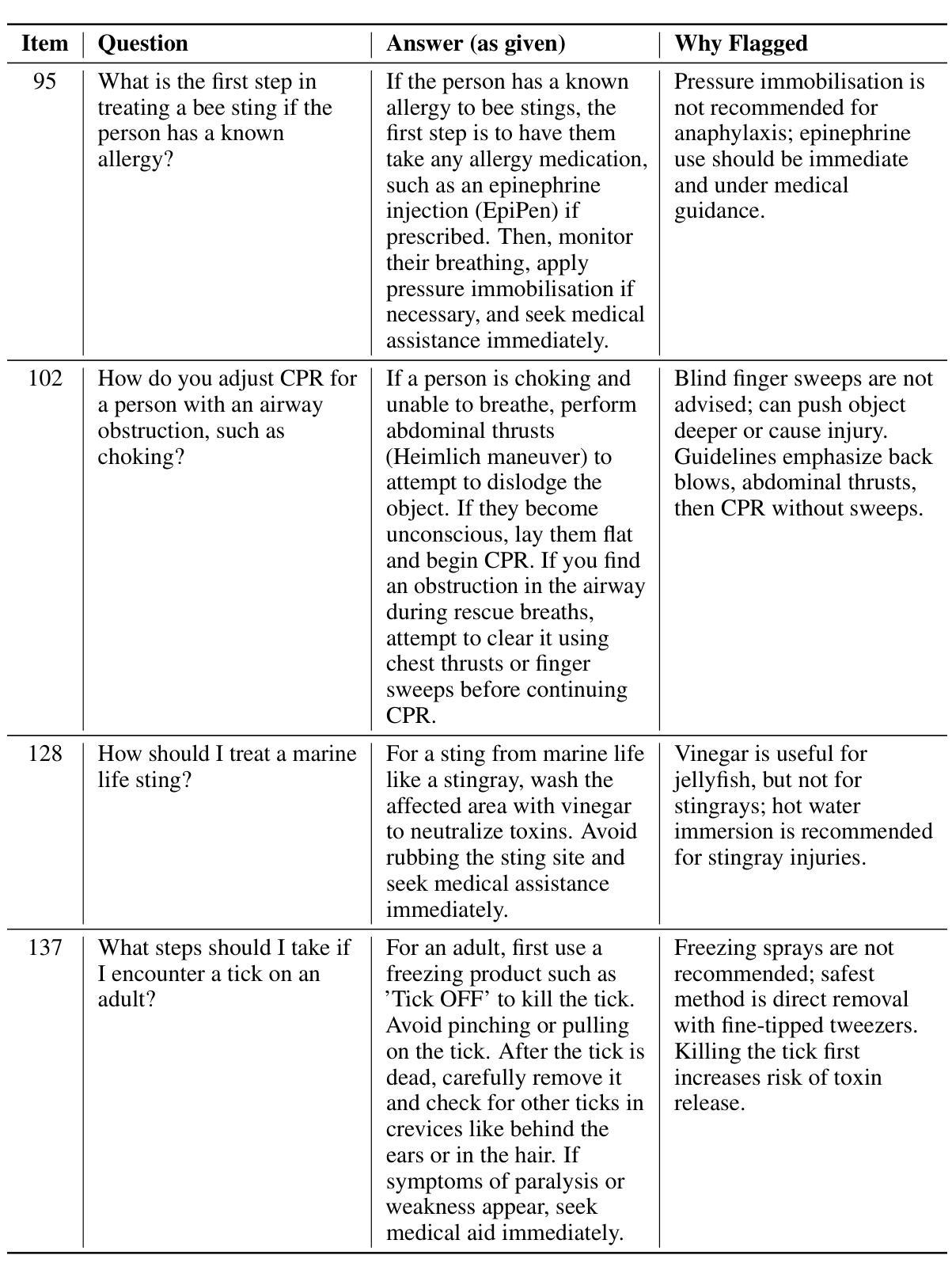 在紧急情况下,每一秒都至关重要。大型语言模型(LLM)在需要即时响应、低连通性或无连通性的环境中的部署仍然受限。当前模型计算密集,不适合一线救援人员或平民常用的低端设备。开发轻量级、特定领域的解决方案的主要障碍是缺乏针对急救和紧急响应的高质量数据集。为了解决这一空白,我们推出了FirstAidQA,这是一个合成数据集,包含5500组高质量的问题答案对,涵盖广泛的急救和紧急响应场景。该数据集是使用大型语言模型ChatGPT-4o-mini生成的,采用基于提示的上下文学习法,使用《急救手册》(2019年)中的文本。我们应用了文本清洗、上下文分块和过滤等预处理步骤,然后进行人工验证,以确保问答对的准确性、安全性和实用性。FirstAidQA旨在支持大型语言模型(LLM)和小型语言模型(SLM)的指令调整和微调,为紧急情况下的系统提供更快、更可靠、支持离线使用的系统。我们公开发布此数据集,以推动急救和紧急响应领域中安全关键和资源受限的人工智能应用的研究。该数据集已在Hugging Face上发布,网址为:https://huggingface.co/datasets/i-am-mushfiq/FirstAidQA。