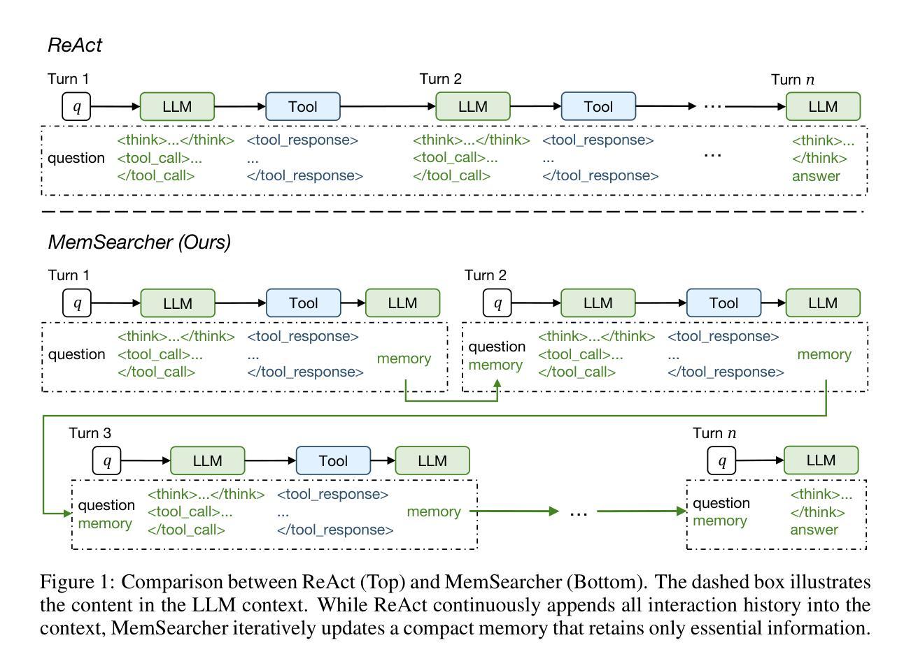 Typical search agents concatenate the entire interaction history into the LLM context, preserving information integrity but producing long, noisy contexts, resulting in high computation and memory costs. In contrast, using only the current turn avoids this overhead but discards essential information. This trade-off limits the scalability of search agents. To address this challenge, we propose MemSearcher, an agent workflow that iteratively maintains a compact memory and combines the current turn with it. At each turn, MemSearcher fuses the user’s question with the memory to generate reasoning traces, perform search actions, and update memory to retain only information essential for solving the task. This design stabilizes context length across multi-turn interactions, improving efficiency without sacrificing accuracy. To optimize this workflow, we introduce multi-context GRPO, an end-to-end RL framework that jointly optimize reasoning, search strategies, and memory management of MemSearcher Agents. Specifically, multi-context GRPO samples groups of trajectories under different contexts and propagates trajectory-level advantages across all conversations within them. Trained on the same dataset as Search-R1, MemSearcher achieves significant improvements over strong baselines on seven public benchmarks: +11% on Qwen2.5-3B-Instruct and +12% on Qwen2.5-7B-Instruct relative average gains. Notably, the 3B-based MemSearcher even outperforms 7B-based baselines, demonstrating that striking a balance between information integrity and efficiency yields both higher accuracy and lower computational overhead. The code and models will be publicly available at https://github.com/icip-cas/MemSearcher