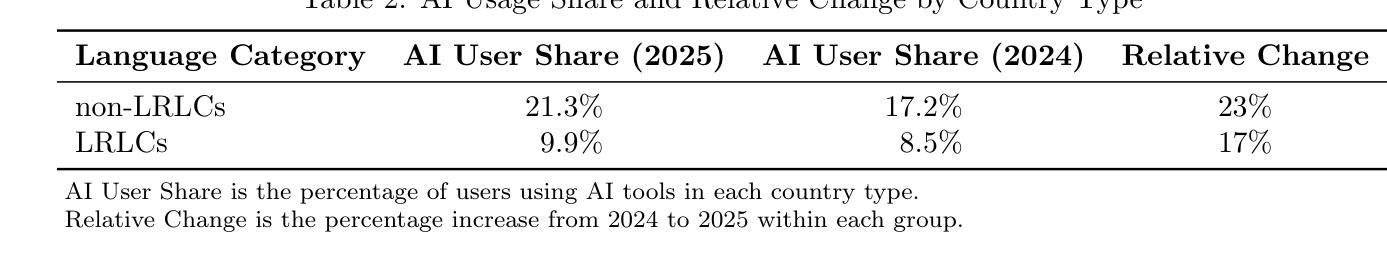 - 人工智能在全球范围内快速扩散,但在低资源语言国家(LRLCs)的采纳程度存在差异。