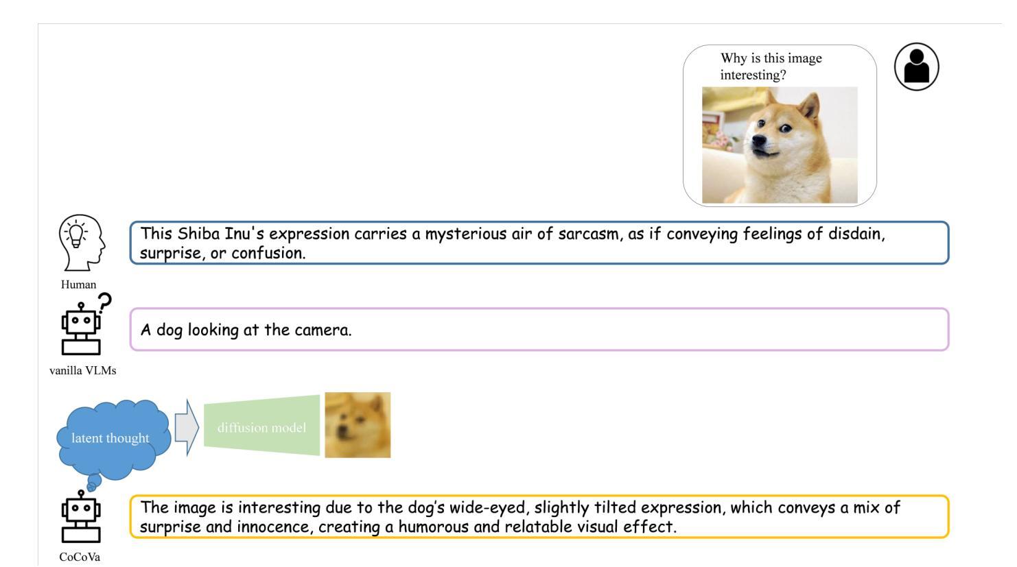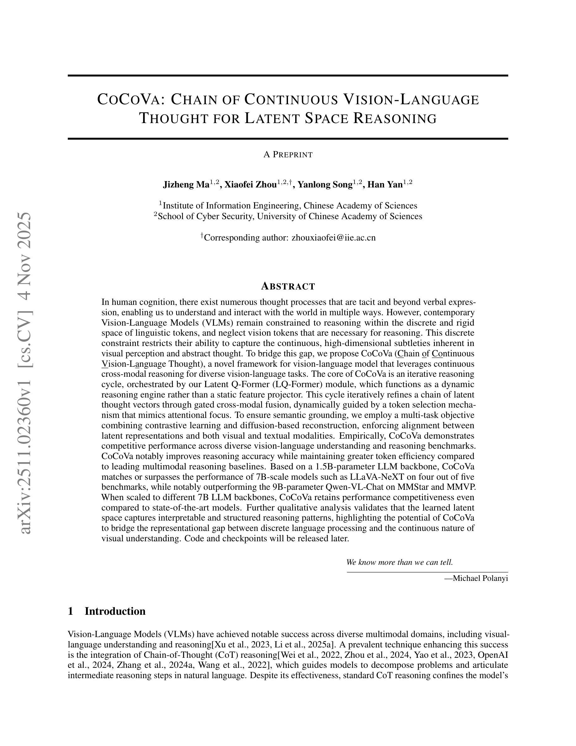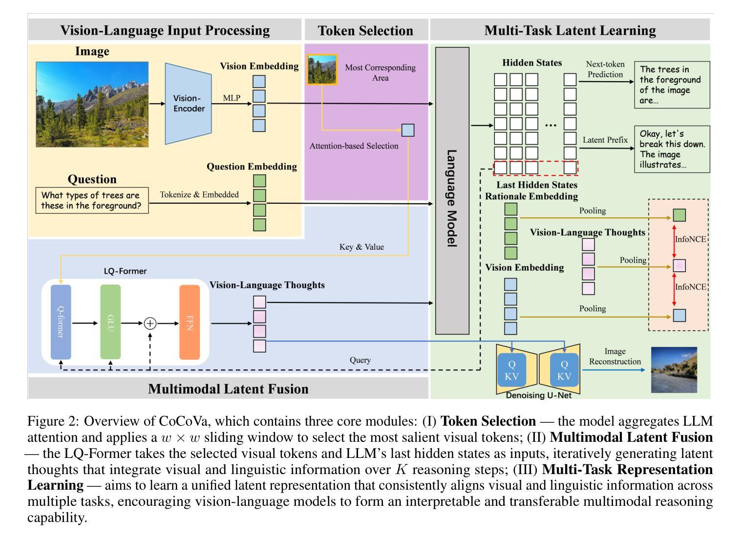 在人类认知中,存在许多无言的、超越语言表达的思维过程,使我们能够以多种方式理解和与世界互动。然而,当前的视觉语言模型(VLMs)仍然受限于语言符号的离散和僵化空间内的推理,从而限制了视觉感知的丰富、高维特性。为了弥补这一差距,我们提出了CoCoVa(连续视觉语言思维链),这是一种用于视觉语言模型的新型框架,它利用连续跨模态推理来完成各种视觉语言任务。CoCoVa的核心是一个迭代推理循环,其中新型潜态Q-Formers(LQ-Formers)作为动态推理引擎,通过跨模态融合迭代地完善一系列潜在思维向量。为了集中这一过程,标记选择机制会动态识别重要的视觉区域,模仿注意力的集中。为了确保这些潜在思维仍然保持根基,我们用多任务目标来训练模型,将对比学习和基于扩散的重建结合起来,强化潜在表征与视觉和文本模态之间的对齐。评估表明,CoCoVa在强大的基线基础上提高了准确性和标记效率。使用规模为1.5B的后端骨干网,它在几乎所有的基准测试中都能与更大的7B-9B模型竞争甚至超越它们。当扩展到规模为7B的大型语言模型后端骨干网时,它仍然与最新模型具有竞争力。定性分析验证了学习到的潜在空间捕获了解释性和结构化推理模式,这突显了CoCoVa在离散语言处理和视觉理解的连续性之间弥合代表性差距的潜力。