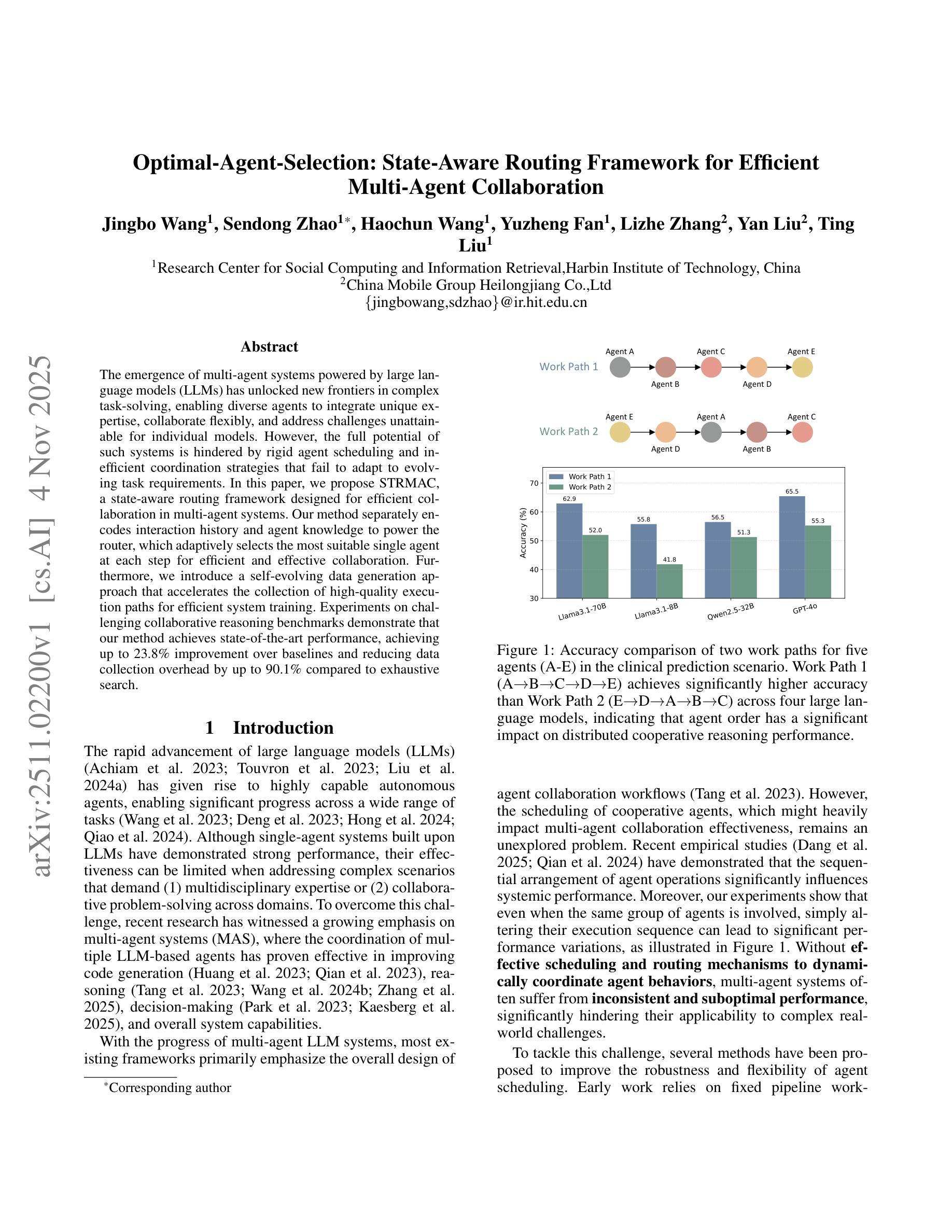 多智能体系统正通过大型语言模型(LLM)的力量开拓复杂任务解决的新疆界,它允许各类智能体融入独特专长,灵活协作,并解决单个模型无法应对的挑战。然而,此类系统的全部潜力受限于僵化的智能体调度和无法适应不断变化的任务要求的低效协调策略。在本文中,我们提出了面向多智能体系统高效协作的状态感知路由框架STRMAC。我们的方法单独编码交互历史和智能体知识来为路由器提供动力,路由器自适应地选择每一步中最合适的单一智能体以实现高效且有效的协作。此外,我们还引入了一种自我进化的数据生成方法,可加速高质量执行路径的收集以用于高效的系统训练。在具有挑战性的协作推理基准测试上的实验表明,我们的方法达到了最先进的性能水平,相较于基线方法实现了高达23.8%的提升,相较于穷举搜索减少了高达90.1%的数据收集开销。