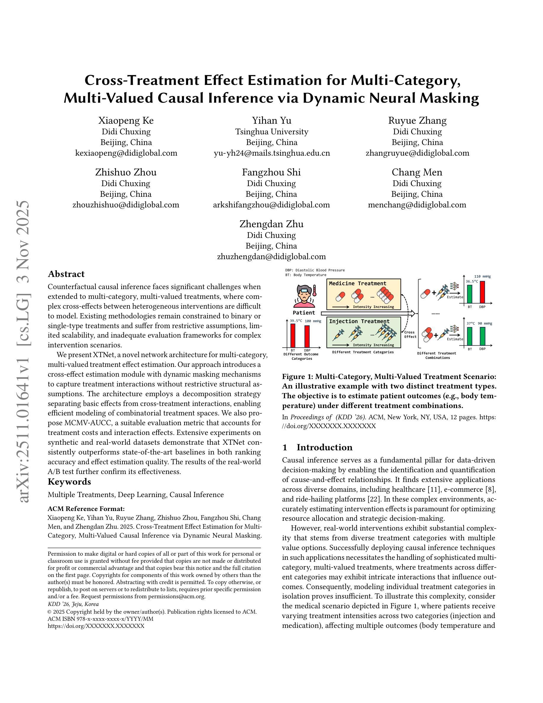 在扩展到多类别、多值处理时,反事实因果推断面临着巨大的挑战。在这种情况下,异质干预之间的复杂交叉效应难以建模。现有方法仍然局限于二元或单一类型的处理,并受到严格假设、有限的可扩展性和复杂的干预场景评估框架不足的困扰。我们提出了XTNet,这是一种用于多类别、多值处理效果估计的新型网络架构。我们的方法引入了一个带有动态屏蔽机制的交叉效应估计模块,可以在没有严格的结构假设的情况下捕获处理交互。该架构采用分解策略,将基本效应与跨处理交互分开,实现对组合处理空间的有效建模。我们还提出了MCMV-AUCC,这是一个适当的评估指标,考虑到处理成本和交互效果。在合成数据和真实世界数据集上的大量实验表明,XTNet在排名准确性和效果估计质量方面都始终优于最新基线。现实世界中的A/B测试结果进一步证实了其有效性。