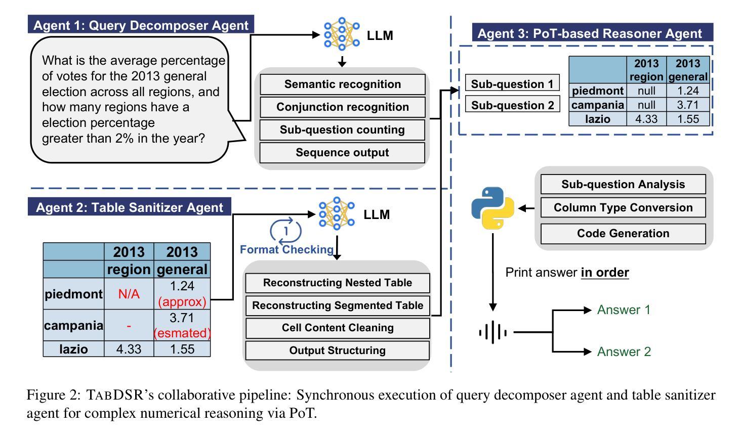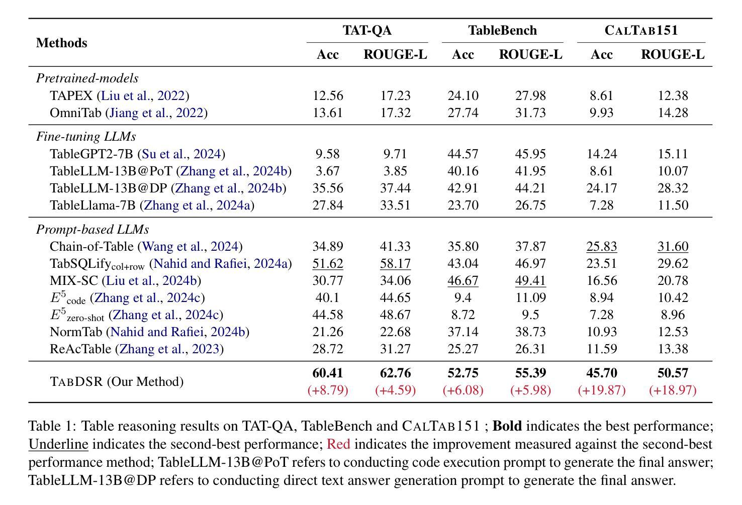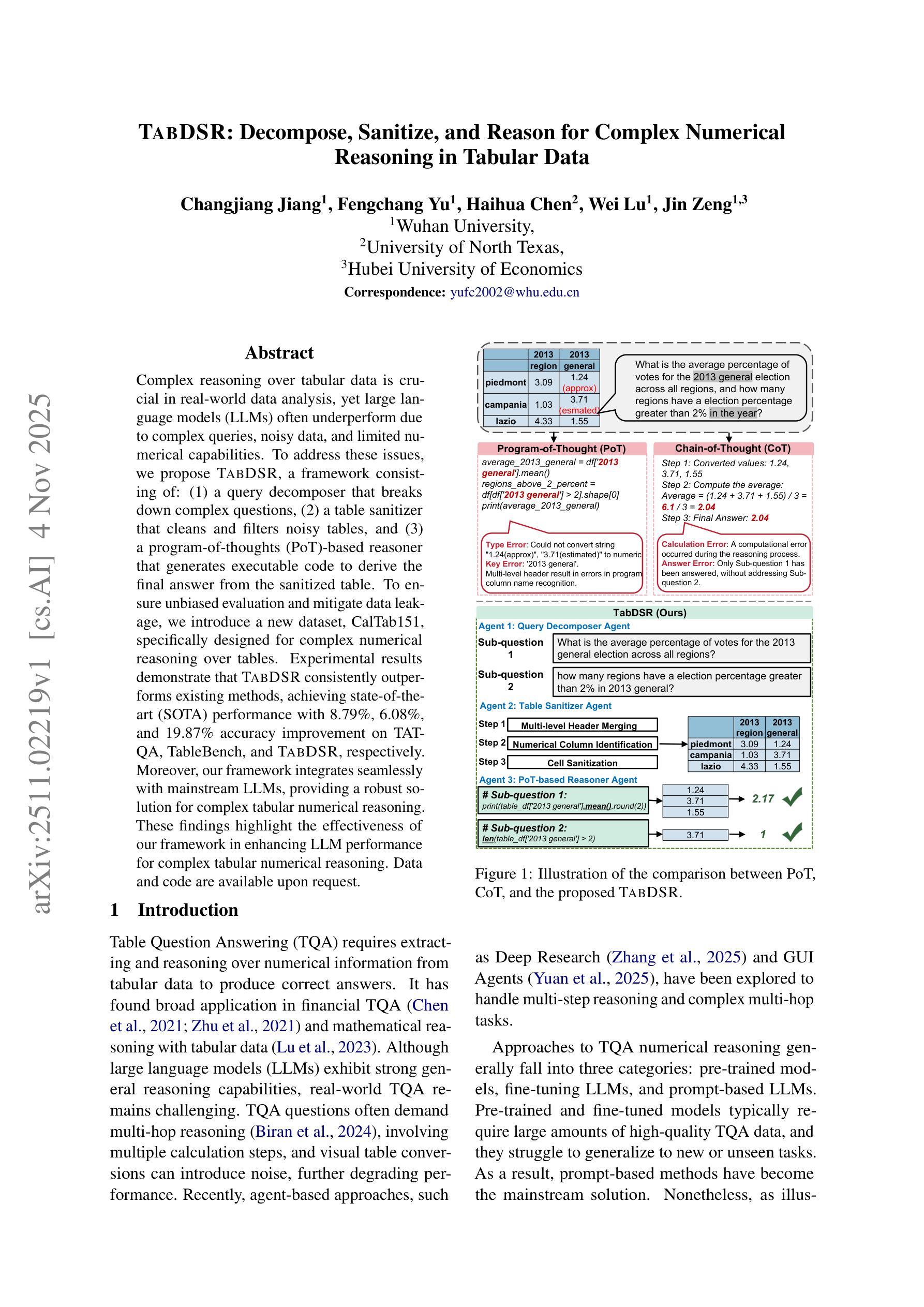 复杂表格数据推理在真实数据分析中具有重要地位,大型语言模型(LLMs)常因复杂查询、噪声数据和有限数值处理能力而表现不佳。为解决这些问题,我们提出名为“方法”的框架,包括查询分解器、表格净化器和基于程序思维(PoT)的推理器。为确保公正评估并避免数据泄露,我们引入专为复杂表格数值推理设计的新数据集CalTab151。实验结果表明,“方法”框架在TAT-QA、TableBench和自身数据集上的准确率分别提高了8.79%、6.08%和19.87%,并始终优于现有方法,达到最新技术水平。此外,“方法”框架与主流LLM无缝集成,为复杂表格数值推理提供了稳健的解决方案。这些发现突显了我们的框架在提升LLM处理复杂表格数值推理性能方面的有效性。数据和代码可供请求获取。