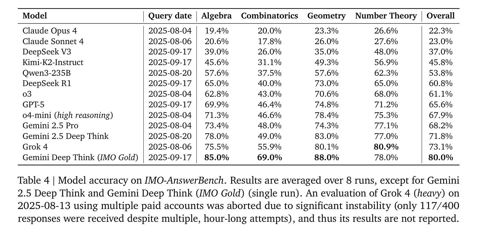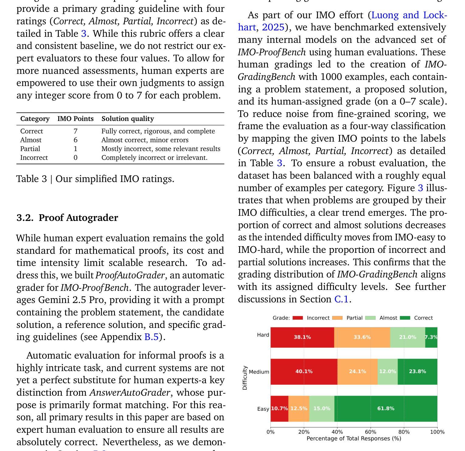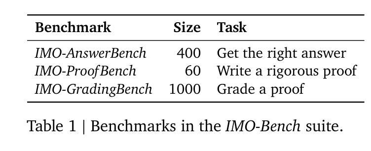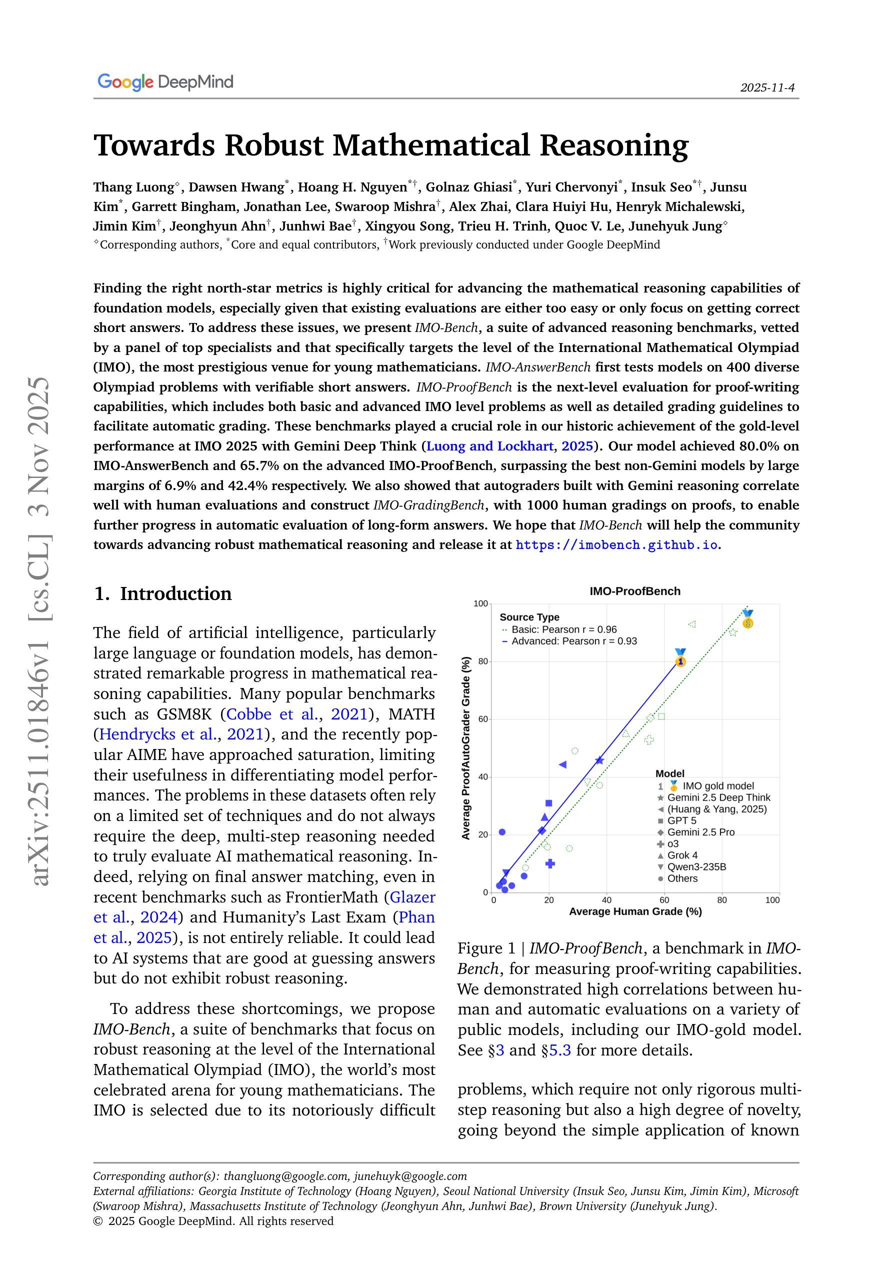 找到正确的北极星指标对于提升基础模型的数学推理能力至关重要,尤其是考虑到现有的评估要么过于简单,要么只关注获得正确的简短答案。为了解决这些问题,我们推出了IMO-Bench,这是一套由顶尖专家团队审核的先进推理基准测试,专门针对国际数学奥林匹克竞赛(IMO)的水平,这是年轻数学家最负盛名的竞技场。IMO-AnswerBench首先测试模型在400个多样化的奥林匹克问题上的简短可验证答案。IMO-Proof Bench是更高层次的证明书写能力评估,其中包括基本和高级的IMO级别问题以及详细的评分标准,以便于自动评分。这些基准测试在我们的历史成就中发挥了关键作用,即在IMO 2025年与双子座深度思考(Luong and Lockhart, 2025)共同取得金牌级表现。我们的模型在IMO-AnswerBench上达到80.0%,在高级IMO-Proof Bench上达到65.7%,远超最佳非双子座模型,分别高出6.9%和42.4%。我们还表明,使用双子座推理构建的自动评分器与人类评估高度相关,并构建了包含1000个证明的人类评分数据的IMO-GradingBench,以便推动长答案的自动评估取得进一步进展。我们希望IMO-Bench能帮助社区推动稳健的数学推理的发展,并在https://imobench.github.io/上发布。