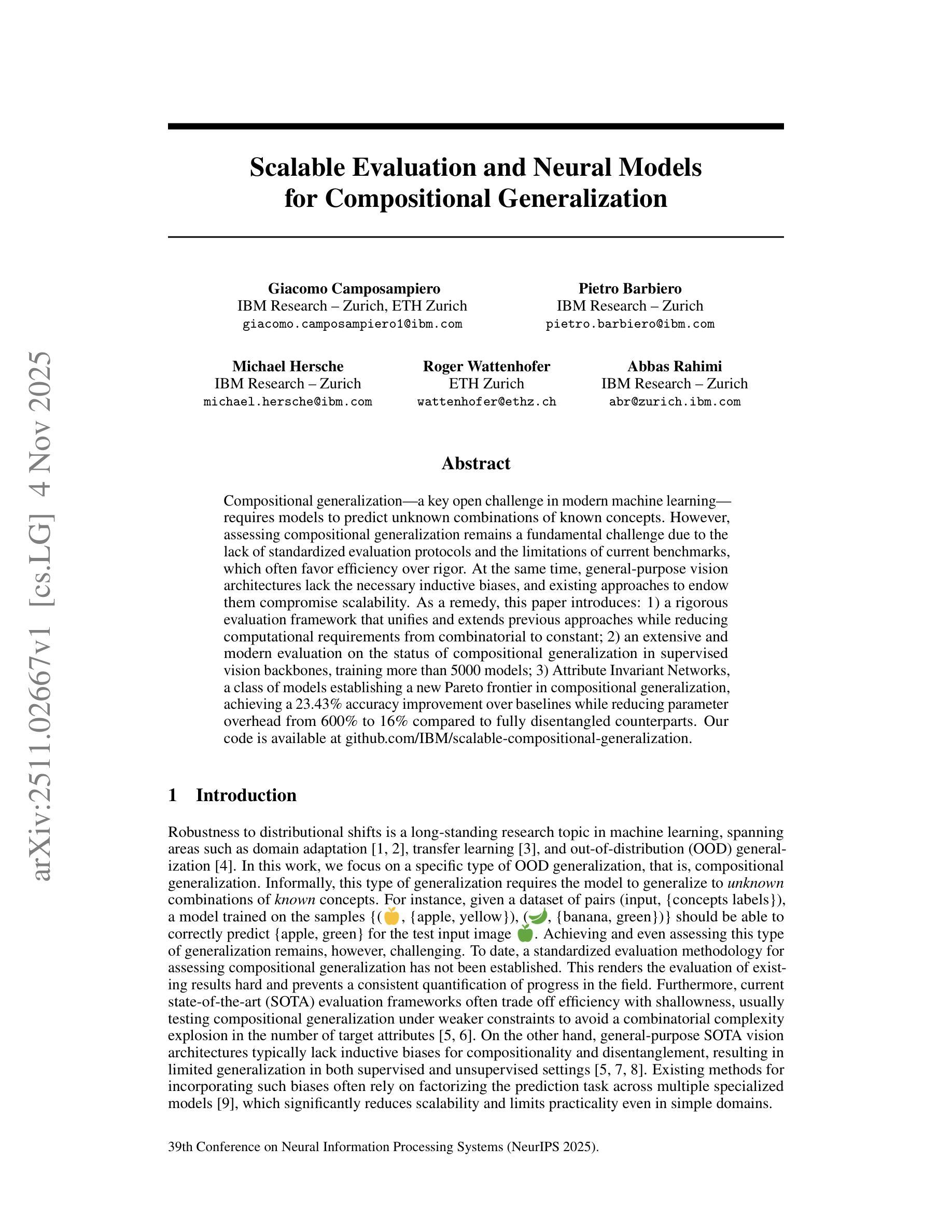 该文探讨了现代机器学习中的关键挑战——组合泛化,它要求模型能够预测已知概念组合的未知情况。文中提出了一个统一的严格评价框架来评估模型在视觉方面的组合泛化能力,建立了一种新型模型评估协议来解决缺乏标准化评价协议和现有基准测试注重效率而非严谨性的问题。此外,引入了一种新型的模型——属性不变网络(Attribute Invariant Networks),它在组成泛化方面建立了新的帕累托边界,与基线相比提高了准确率。相较于完全分离对等模型,它降低了参数开销,在保证了良好泛化能力的同时兼具较低的复杂度。此外还提出了一种较为简单的度量框架以减少测试所需的计算资源要求,降低了之前所达到的大规模数据集合训练的测试模型评估框架下的运算负荷水平要求较高的成本。通过训练超过五千个模型对监督视觉主干进行了全面的现代评估。