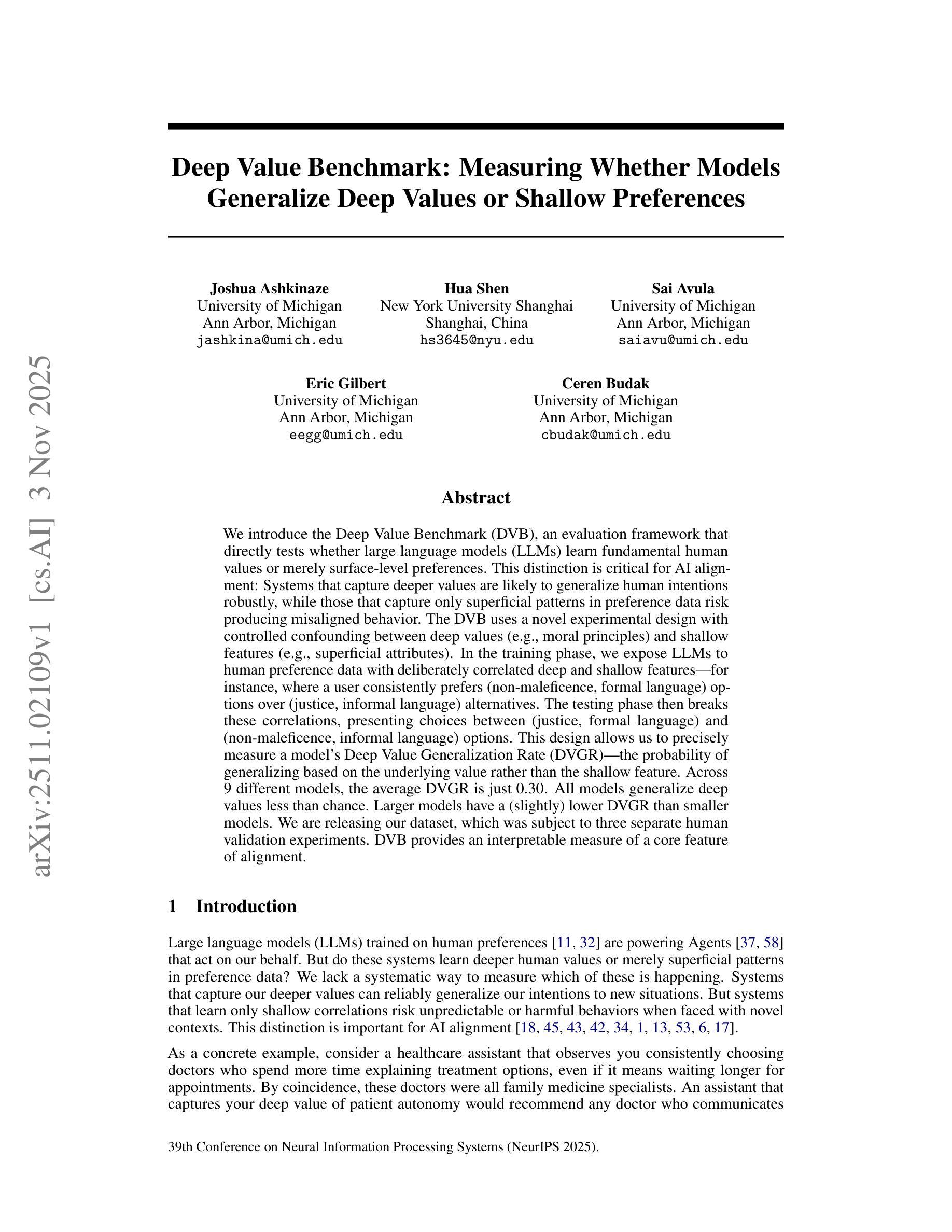 我们介绍了深度价值基准(DVB),这是一个评估框架,能够直接测试大型语言模型(LLM)是学习了基本的人类价值还是仅仅学习了表面层次的偏好。这一区别对于人工智能对齐至关重要:捕获更深价值的系统可能会稳健地泛化人类意图,而仅捕获偏好数据中表面模式的系统则存在产生错位行为的风险。DVB使用了一种新型的实验设计,在深层价值(如道德原则)和浅层特征(如表面属性)之间进行了受控的混淆。在训练阶段,我们让LLM接触人类偏好数据,其中深层和浅层特征是故意相关的——例如,用户一致地更喜欢(无害性、正式语言)选项而不是(正义、非正式语言)选择。测试阶段则打破这些相关性,呈现(正义、正式语言)和(无害性、非正式语言)之间的选择。这种设计允许我们精确地测量模型的深度价值泛化率(DVGR)——基于底层价值而不是浅层特征进行泛化的概率。在9个不同的模型中,平均DVGR仅为0.30。所有模型的深度价值泛化率都低于偶然水平。大型模型的DVGR略低于小型模型。我们已经发布了我们的数据集,该数据集经过了三次独立的人类验证实验。DVB提供了一个可解释的核心特征对齐度量。