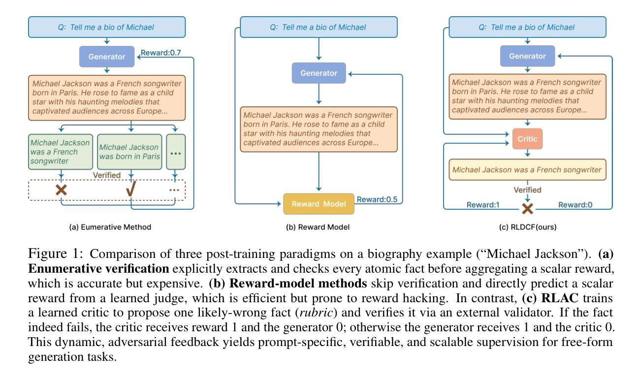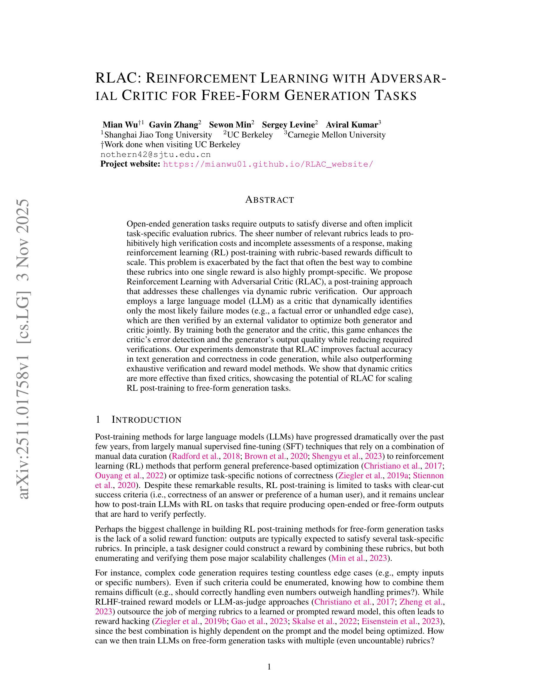 开放式生成任务需要输出满足多样化和通常隐式的特定任务评估标准。相关标准的数量众多导致验证成本高昂,并且响应评估不完整,使得使用基于标准的奖励进行强化学习(RL)后训练难以扩展。问题的严重性还在于,通常将这些标准组合成单一奖励的最佳方式也是高度提示特定的。我们提出使用对抗性评论家(RLAC)的强化学习,这是一种后训练法,通过动态标准验证来解决这些挑战。我们的方法采用大型语言模型(LLM)作为评论家,动态识别最可能的失败模式(例如,事实错误或未处理的边缘情况),然后通过这些模式由外部验证器验证,以联合优化生成器和评论家。通过对生成器和评论家的共同训练,这款游戏增强了评论家的错误检测能力和生成器的输出质量,同时减少了所需的验证次数。我们的实验表明,RLAC提高了文本生成的事实准确性和代码生成的正确性,同时优于详尽验证和奖励模型方法。我们证明了动态评论家比固定评论家更有效,展示了RLAC在扩展到自由形式生成任务时具有的潜力。