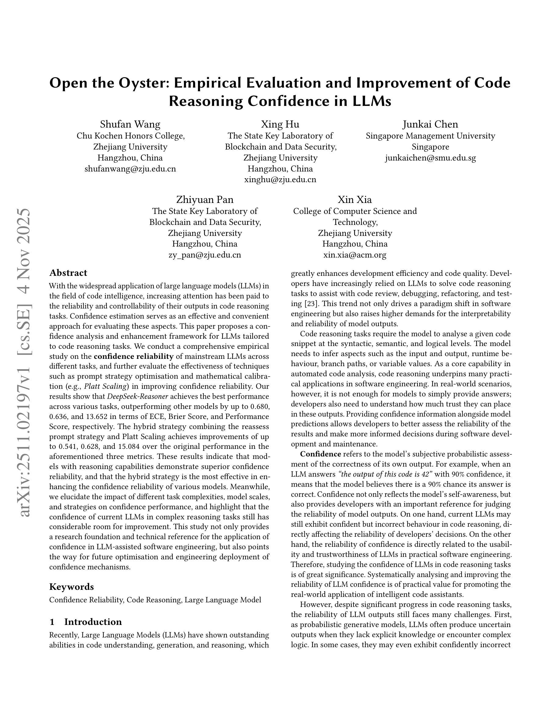 随着大型语言模型(LLMs)在代码智能领域的广泛应用,其输出在代码推理任务中的可靠性和可控性引起了越来越多的关注。信心估计是一种有效和方便的评估这些方面的方法。本文针对代码推理任务,提出了一个针对LLMs的信心分析和增强框架。我们对主流LLMs在不同任务上的信心可靠性进行了全面的实证研究,并进一步评估了优化提示策略和数学校准(如Platt Scaling)等技术提高信心可靠性的有效性。实验结果显示,DeepSeek-Reasoner在各种任务上表现最佳,与其他模型相比,其在ECE、Brier Score和Performance Score上的表现分别提高了0.680、0.636和13.652。结合重新评估提示策略和Platt Scaling的混合策略,在上述三个指标中分别提高了0.541、0.628和15.084。这些结果表明,具有推理能力的模型表现出更高的信心可靠性,混合策略是最有效的增强各种模型信心可靠性的方法。同时,本文阐明了不同任务复杂度、模型规模、策略对信心表现的影响,并强调当前LLMs在复杂推理任务中的信心仍有很大的改进空间。本研究不仅为信心在LLM辅助软件工程中的应用提供了研究基础和技术参考,也为信心机制的未来优化和工程部署指明了方向。