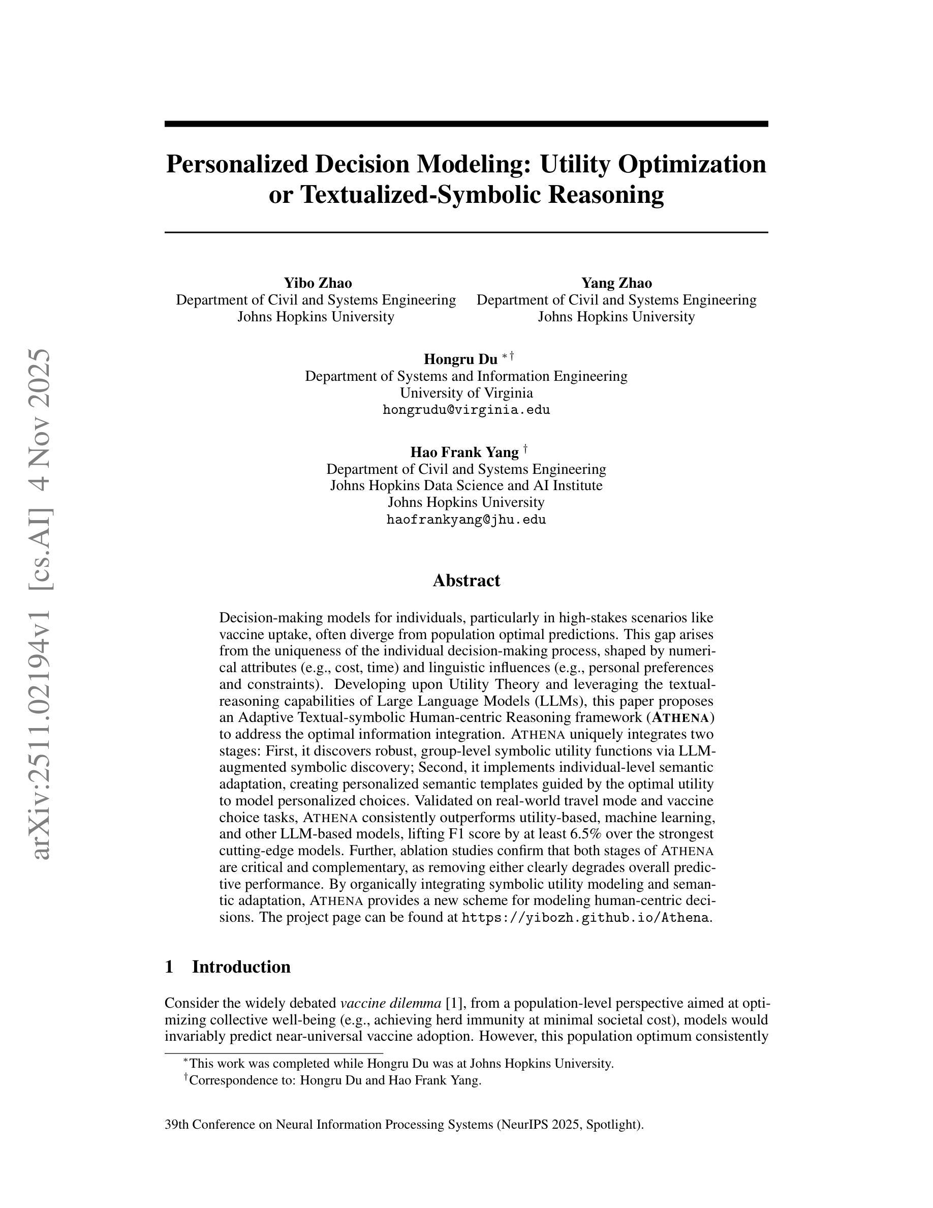 针对个人决策制定的模型,特别是在疫苗接种等高风险场景中,往往与群体最优预测存在分歧。这一差距的产生源于个人决策制定过程的独特性,这一过程受到数值属性(如成本、时间)和语言影响(如个人偏好和约束)的影响。本文基于效用理论,利用大型语言模型的文本推理能力,提出了自适应文本符号人类中心推理框架(ATHENA),以解决最优信息融合问题。ATHENA独特地集成了两个阶段:首先,它通过大型语言模型增强的符号发现来发现稳健的群体层面符号效用函数;其次,它实现个体层面的语义适应,创建由最佳效用引导的个性化语义模板,以模拟个性化选择。在真实世界的出行模式和疫苗选择任务中进行了验证,ATHENA始终优于基于效用、机器学习和其他大型语言模型的方法,比最先进的模型高出至少6.5%的F1分数。此外,切除研究证实ATHENA的两个阶段都是关键且互补的,移除任何一个都会明显降低整体预测性能。通过有机地结合符号效用建模和语义适应,ATHENA为模拟以人类为中心的决策提供了新的方案。项目页面可在https://yibozh.github.io/Athena找到。
