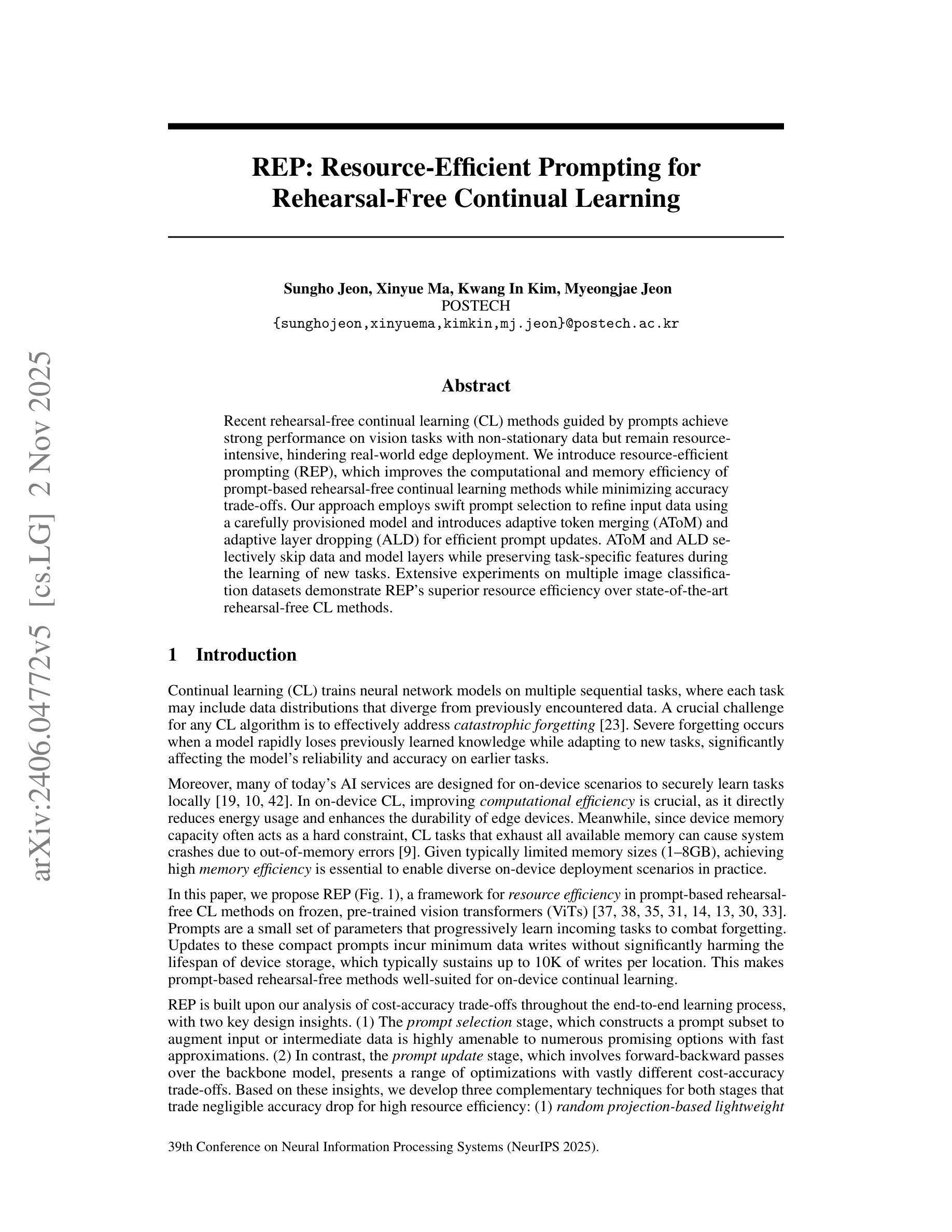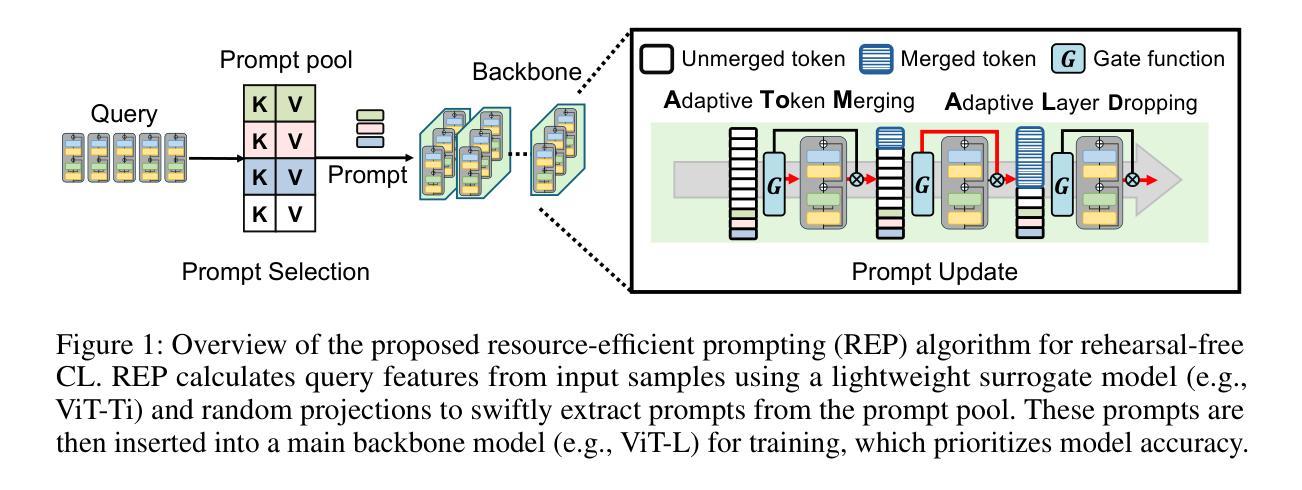 在无需复现的连续学习(CL)方法中,基于提示的方法在非稳态数据上实现了强大的视觉任务性能,但资源消耗仍然很大,阻碍了其在边缘设备部署中的实际应用。我们引入了资源高效提示(REP),它在提高基于提示的无复现连续学习方法的同时,尽量减少准确度的权衡。我们的方法采用快速提示选择来优化输入数据,并使用精心准备的模型进行微调,并引入自适应令牌合并(AToM)和自适应层丢弃(ALD)来实现高效的提示更新。AToM和ALD在学习新任务时选择性跳过数据和模型层,同时保留特定任务的特性。在多个图像分类数据集上的广泛实验表明,REP在资源效率方面优于最新的无复现CL方法。