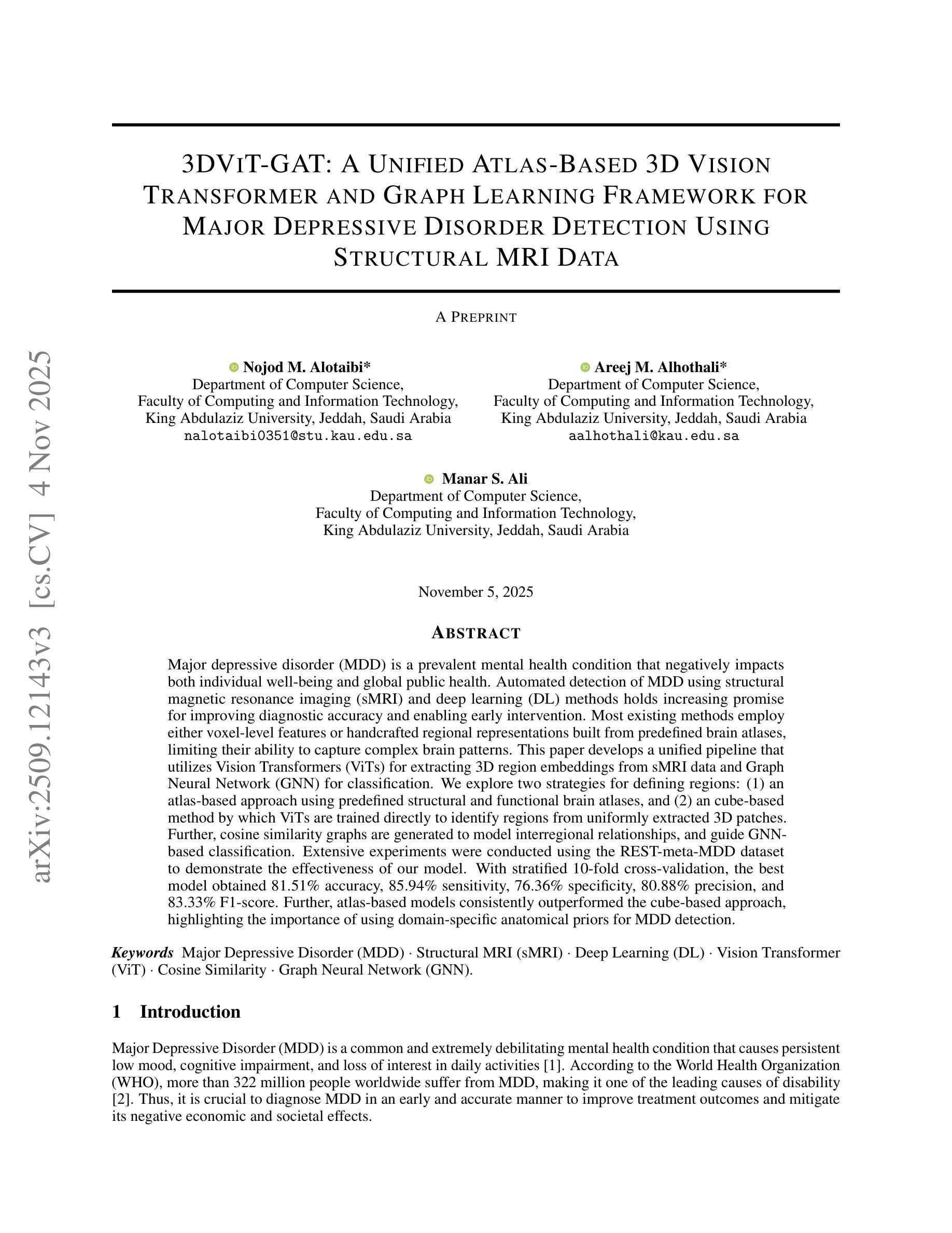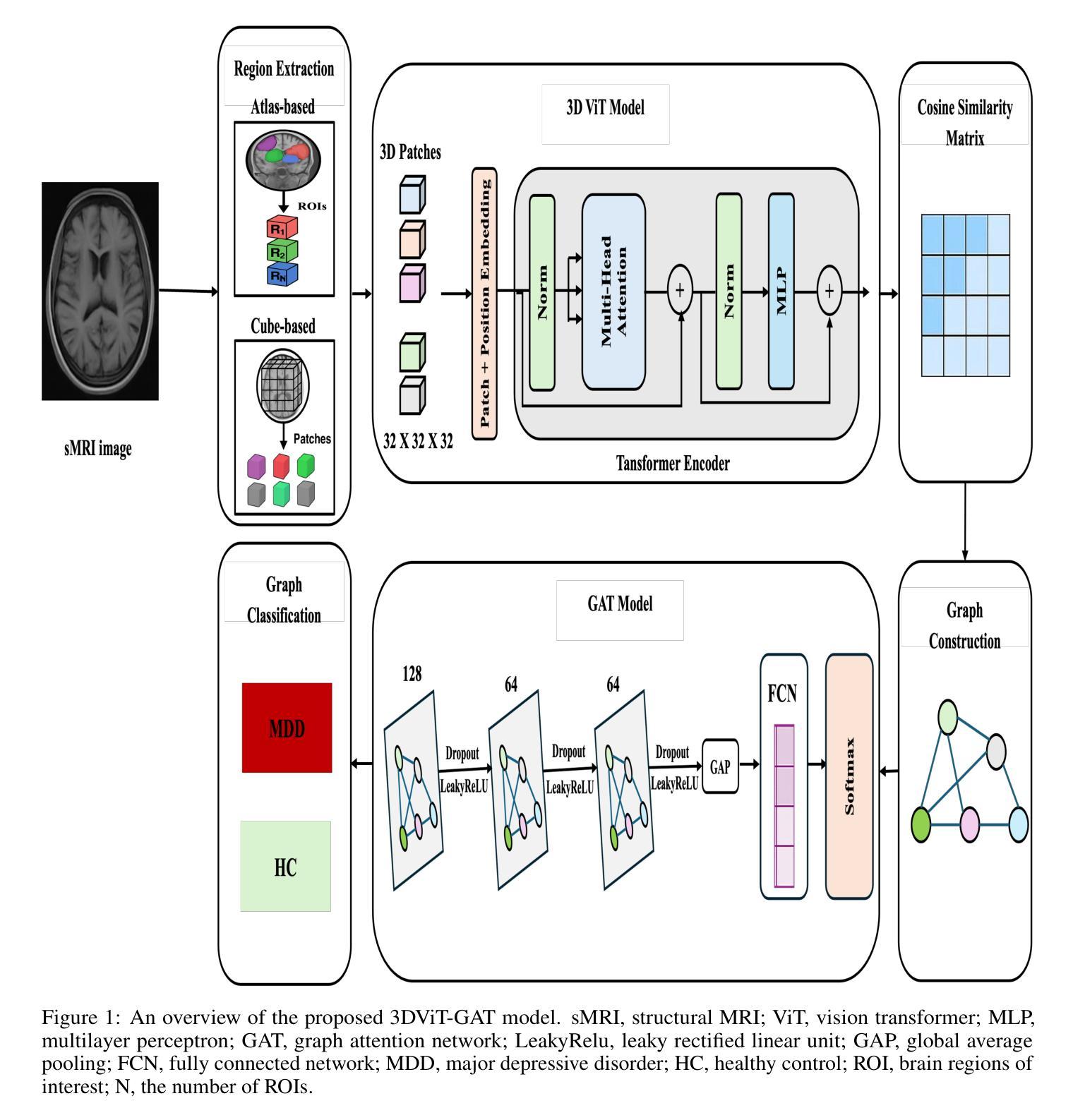 抑郁症是一种常见的心理健康疾病,对个人福祉和全球公共卫生都有负面影响。利用结构磁共振成像(sMRI)和深度学习(DL)方法进行抑郁症的自动化检测在提高诊断准确性和早期干预方面有着巨大的潜力。大多数现有方法采用基于体素的特征或根据预先定义的脑图谱手工构建的区域表示,这限制了它们捕捉复杂脑模式的能力。本文开发了一个统一的流程,利用视觉转换器(ViTs)从sMRI数据中提取三维区域嵌入,并利用图神经网络(GNN)进行分类。我们探索了两种定义区域的方法:(1)一种基于图谱的方法,使用预先定义的结构和功能脑图谱;(2)一种基于立方体块的方法,训练ViTs直接识别从均匀提取的三维斑块区域。此外,通过构建余弦相似度图来模拟区域间的关系,并引导基于GNN的分类。我们使用了REST-meta-MDD数据集进行大量实验,以证明我们模型的有效性。通过分层十折交叉验证,最佳模型获得了81.51%的准确率、85.94%的灵敏度、76.36%的特异度、80.88%的精确度和83.33%的F1分数。此外,基于图谱的模型持续优于基于立方体块的方法,突显了在抑郁症检测中使用特定领域的解剖学先验信息的重要性。
