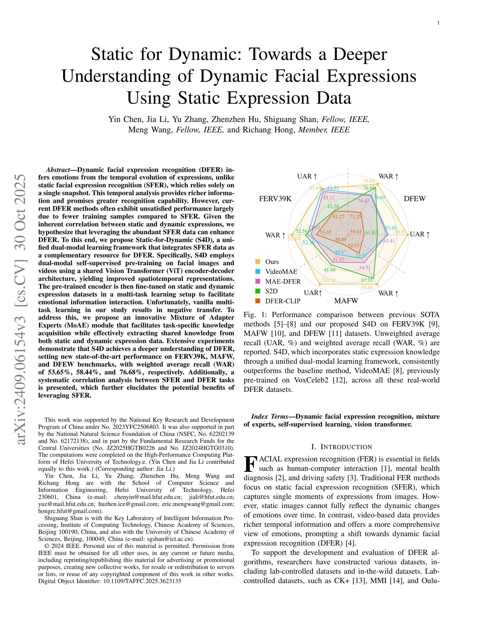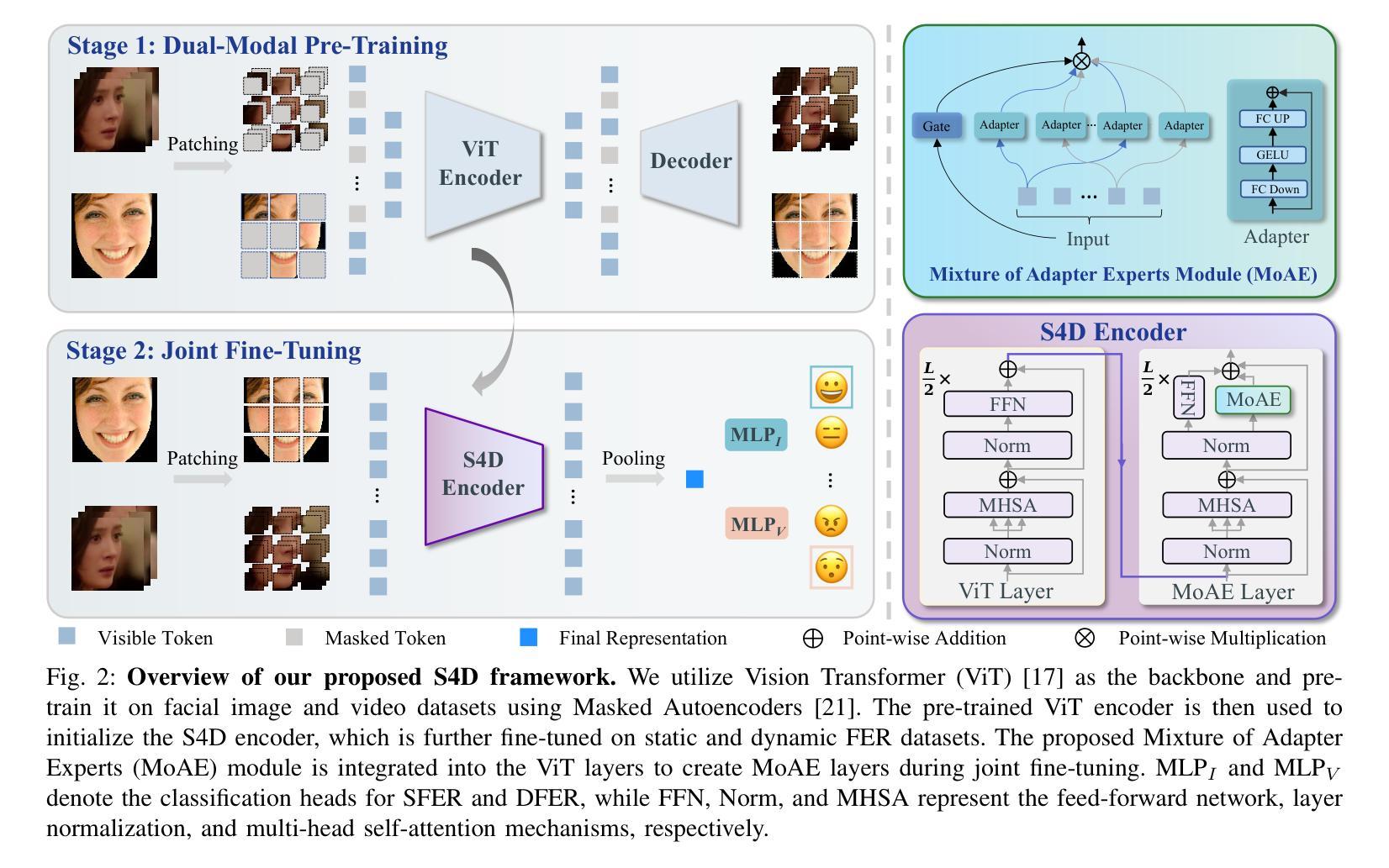 动态面部表情识别(DFER)是从表情的时间演变中推断情感,不同于静态面部表情识别(SFER),后者仅依赖于单一快照。这种时间分析提供了更丰富的信息,并承诺具有更大的识别能力。然而,当前的DFER方法通常由于训练样本较少而表现不佳,与SFER相比。鉴于静态和动态表情之间的内在关联,我们假设利用丰富的SFER数据可以增强DFER。为此,我们提出了Static-for-Dynamic(S4D),这是一个统一的双模态学习框架,它将SFER数据作为DFER的补充资源。具体来说,S4D采用面部图像和视频的双重模态自监督预训练,使用共享的Vision Transformer(ViT)编码器-解码器架构,产生改进的时空表示。然后,在多任务学习设置中对静态和动态表情数据集对预训练的编码器进行微调,以促进情感信息交互。然而,我们研究中的简单多任务学习导致了负面迁移。为了解决这一问题,我们提出了创新的Mixture of Adapter Experts(MoAE)模块,它有助于获取特定任务的知识,同时有效地从静态和动态表情数据中提取共享知识。大量实验表明,S4D对DFER有了更深入的理解,在FERV39K、MAFW和DFEW基准测试上创下了最新纪录,加权平均召回率分别为53.65%、58.44%和76.68%。此外,还进行了SFER和DFER任务之间的系统相关性分析,进一步阐明了利用SFER的潜在优势。