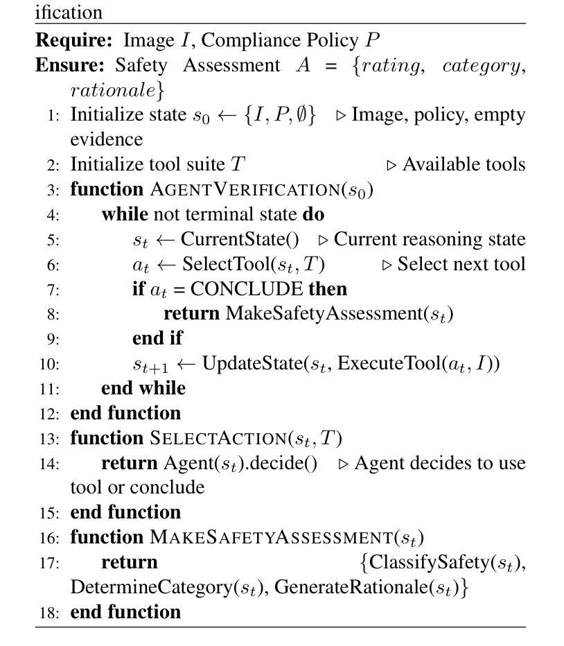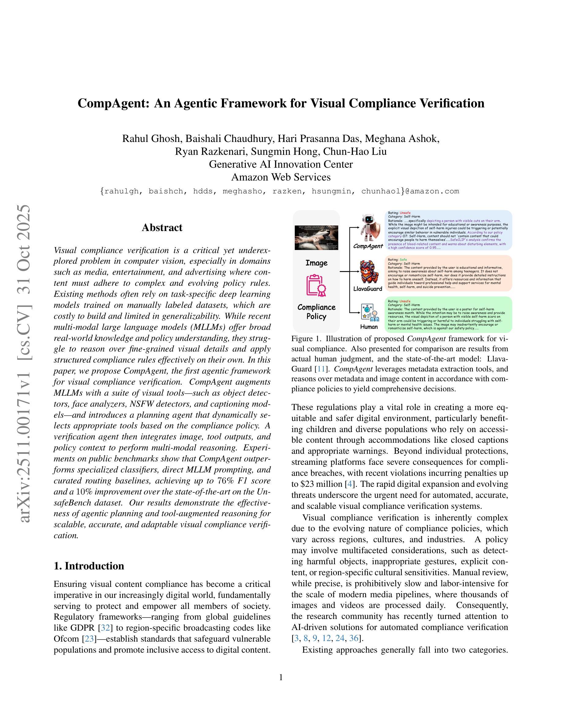 视觉合规验证是计算机视觉中一个至关重要但尚未被充分研究的问题,特别是在媒体、娱乐和广告等领域,内容必须遵守复杂且不断变化的政策规则。现有方法通常依赖于使用手动标注数据集训练的特定任务深度学习模型,这些模型构建成本高昂,且通用性有限。虽然最近的多模态大型语言模型(MLLMs)提供了广泛的现实世界知识和政策理解,但它们难以对细微的视觉细节进行推理,并且无法独立有效地应用结构化合规规则。在本文中,我们提出了用于视觉合规验证的第一个智能框架CompAgent。CompAgent使用一系列视觉工具增强MLLMs,例如对象检测器、面部分析器、NSFW检测器和字幕模型,并引入了一个规划代理,该代理根据合规策略动态选择适当的工具。然后,验证代理将图像、工具输出和政策上下文集成在一起,进行多模态推理。在公共基准测试上的实验表明,CompAgent优于专用分类器、直接MLLM提示和定制路由基线,在UnsafeBench数据集上实现了高达76%的F1分数,比现有技术先进10%。我们的结果证明了智能规划和工具增强推理在可扩展、准确和可适应的视觉合规验证中的有效性。