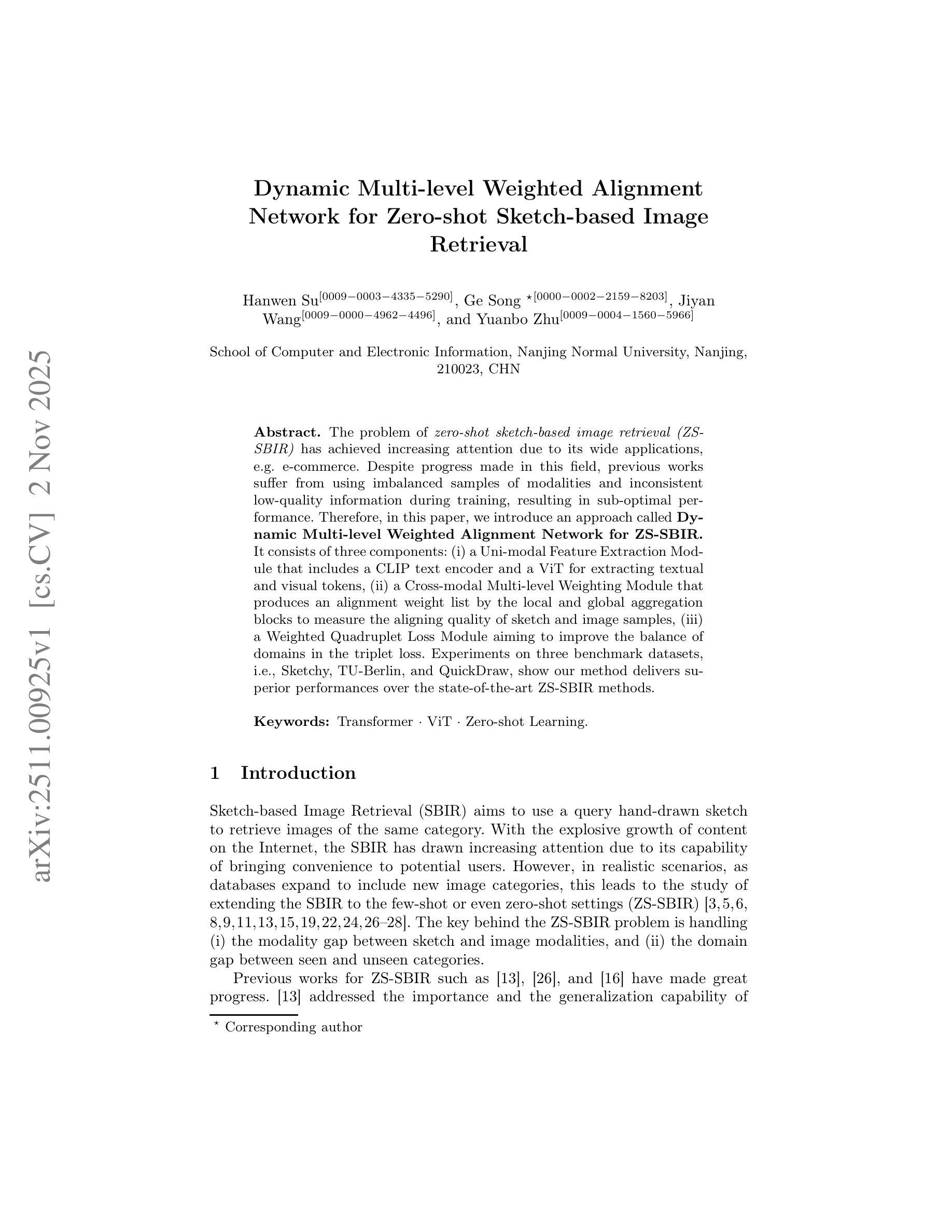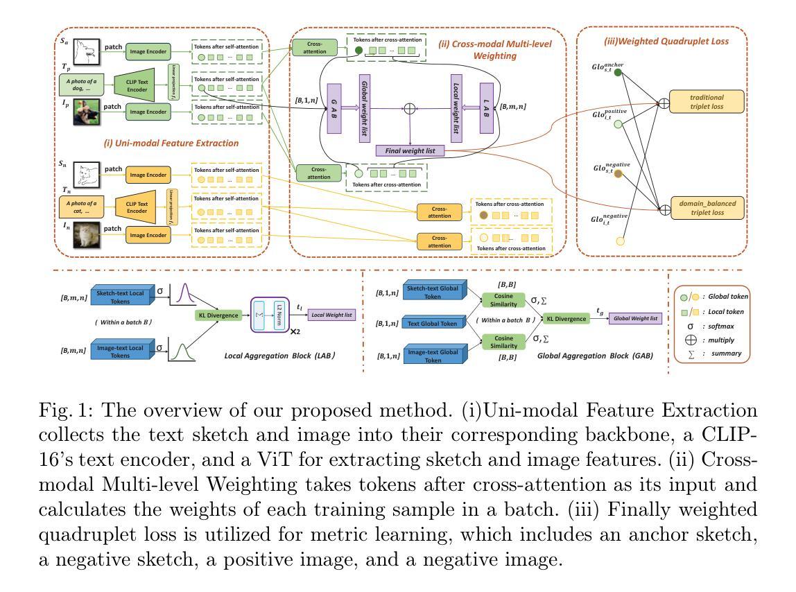 基于零样本的草图图像检索(ZS-SBIR)问题因其广泛的应用(例如电子商务)而备受关注。尽管该领域已经取得了一些进展,但之前的工作在训练过程中存在模态样本不平衡和获取的不一致、低质量信息的问题,导致性能不佳。因此,本文介绍了一种名为动态多级加权对齐网络(Dynamic Multi-level Weighted Alignment Network)的ZS-SBIR方法。它由三个部分组成:(i)单模态特征提取模块,包括CLIP文本编码器和用于提取文本和视觉标记的ViT;(ii)跨模态多级加权模块,通过局部和全局聚合块生成对齐权重列表,以测量草图和图像样本的对齐质量;(iii)加权四重损失模块,旨在改善三重损失中的域平衡。在Sketchy、TU-Berlin和QuickDraw三个基准数据集上的实验表明,我们的方法在零样本草图图像检索领域的性能优于最先进的方法。