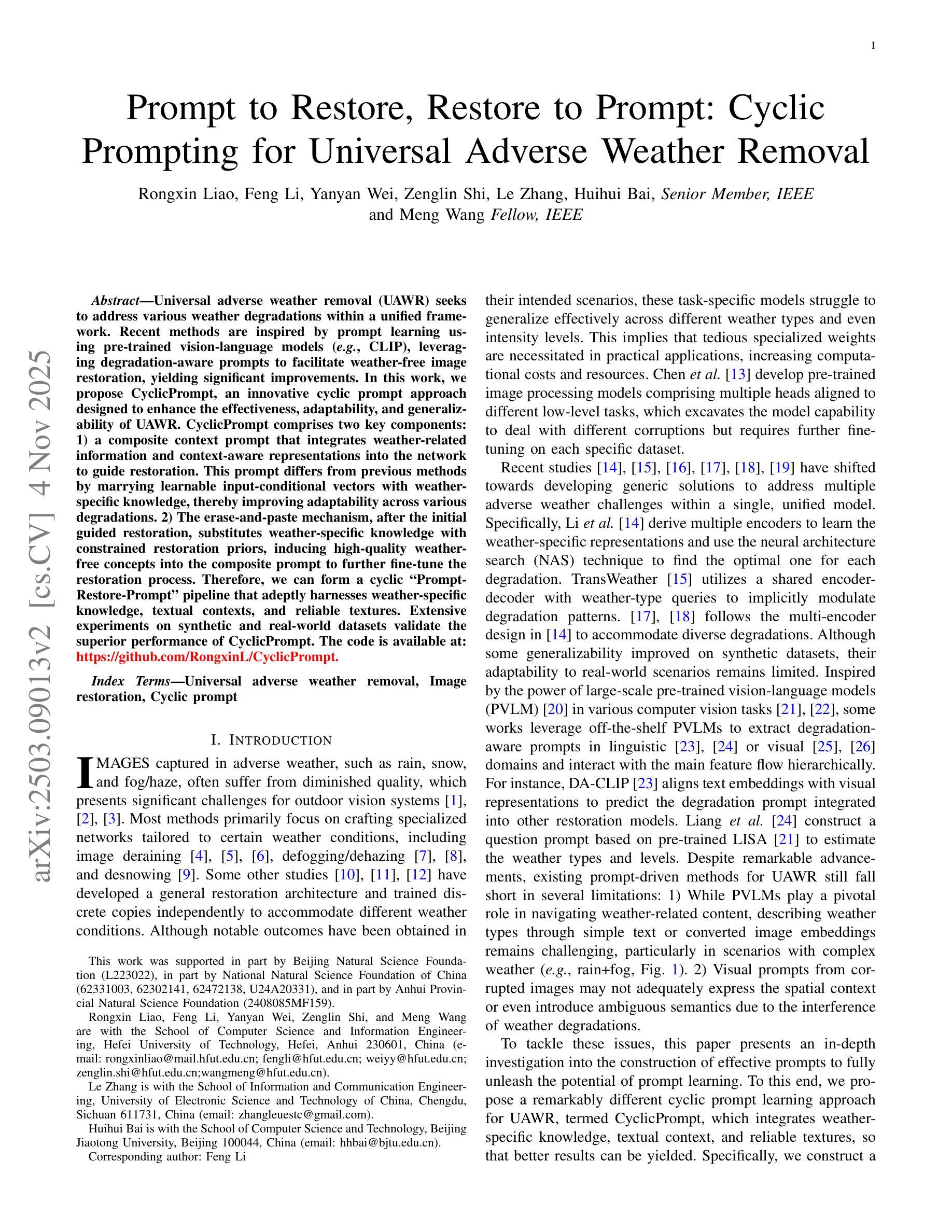 Universal adverse weather removal (UAWR) seeks to address various weather degradations within a unified framework. Recent methods are inspired by prompt learning using pre-trained vision-language models (e.g., CLIP), leveraging degradation-aware prompts to facilitate weather-free image restoration, yielding significant improvements. In this work, we propose CyclicPrompt, an innovative cyclic prompt approach designed to enhance the effectiveness, adaptability, and generalizability of UAWR. CyclicPrompt Comprises two key components: 1) a composite context prompt that integrates weather-related information and context-aware representations into the network to guide restoration. This prompt differs from previous methods by marrying learnable input-conditional vectors with weather-specific knowledge, thereby improving adaptability across various degradations. 2) The erase-and-paste mechanism, after the initial guided restoration, substitutes weather-specific knowledge with constrained restoration priors, inducing high-quality weather-free concepts into the composite prompt to further fine-tune the restoration process. Therefore, we can form a cyclic “Prompt-Restore-Prompt” pipeline that adeptly harnesses weather-specific knowledge, textual contexts, and reliable textures. Extensive experiments on synthetic and real-world datasets validate the superior performance of CyclicPrompt. The code is available at: https://github.com/RongxinL/CyclicPrompt.
