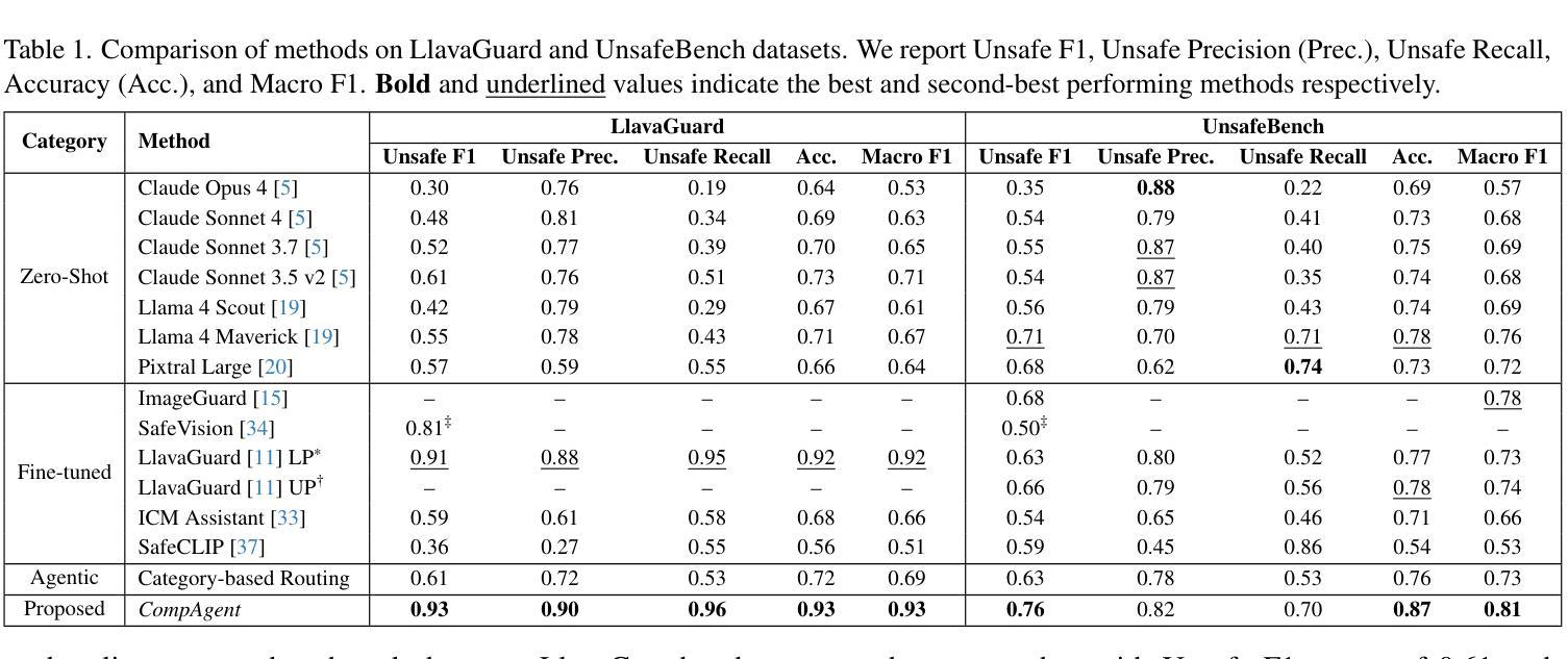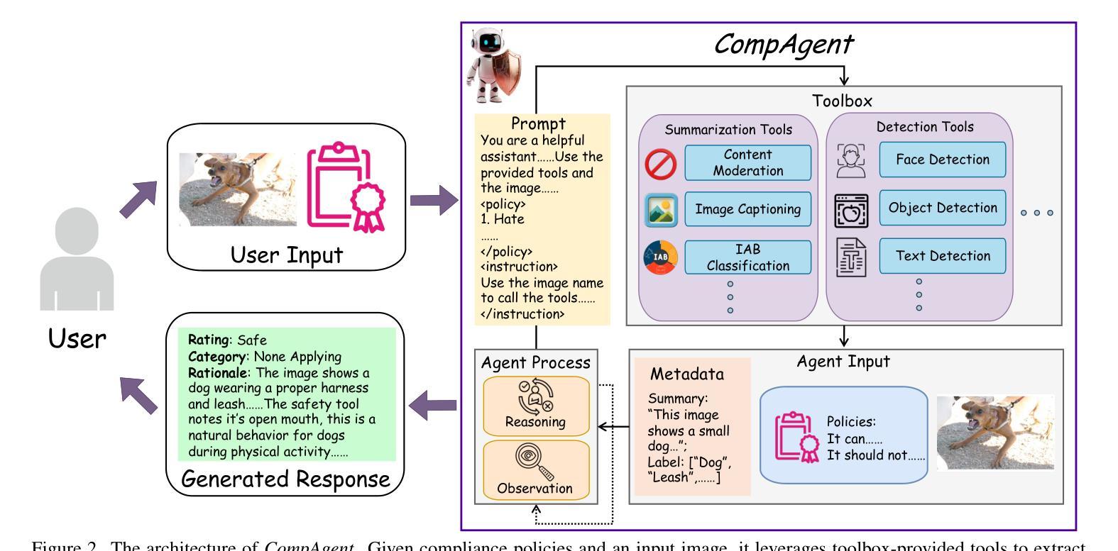 - CompAgent包括规划agent和验证agent,分别负责根据合规政策选择工具和整合图像、工具输出及政策上下文进行多模态推理。
