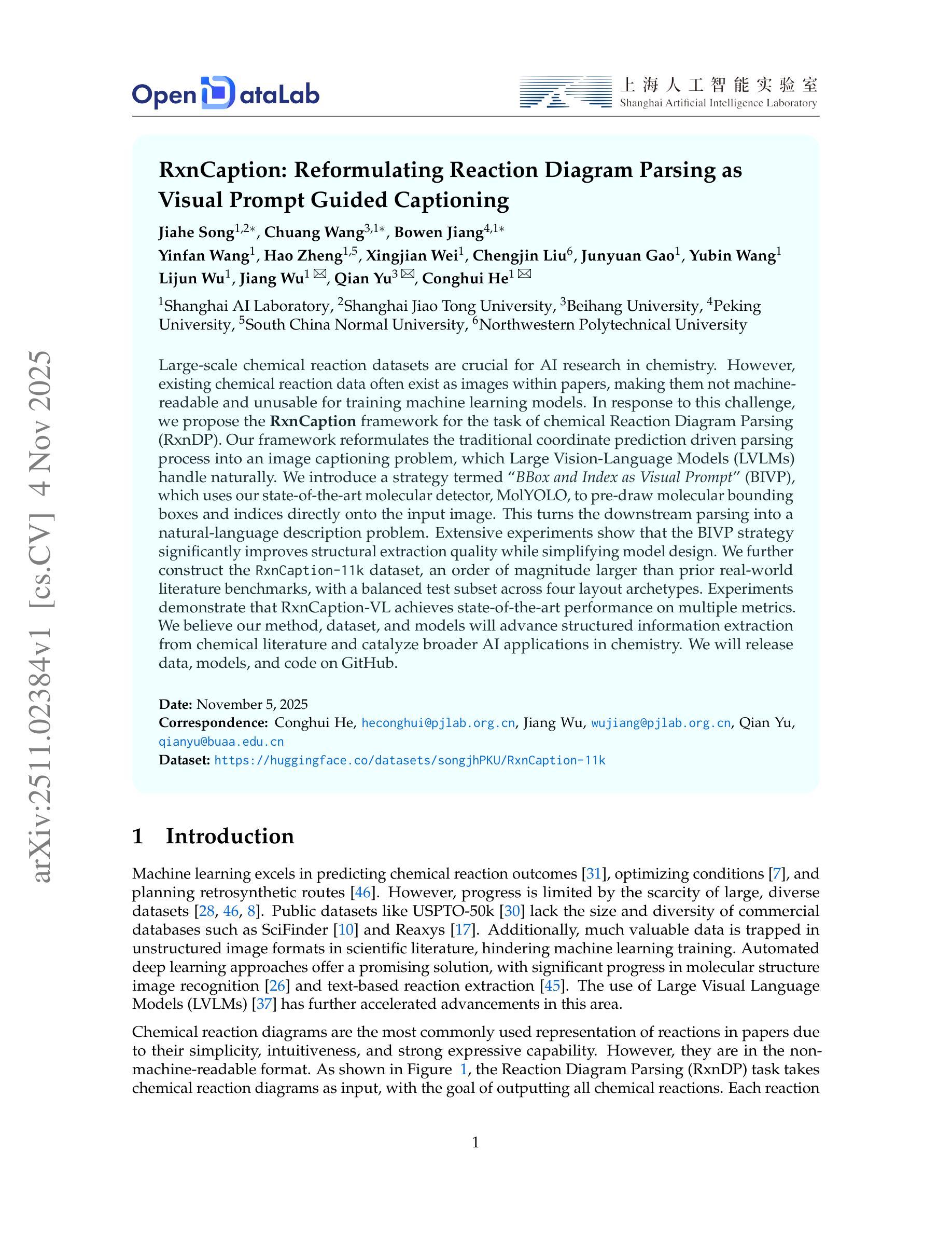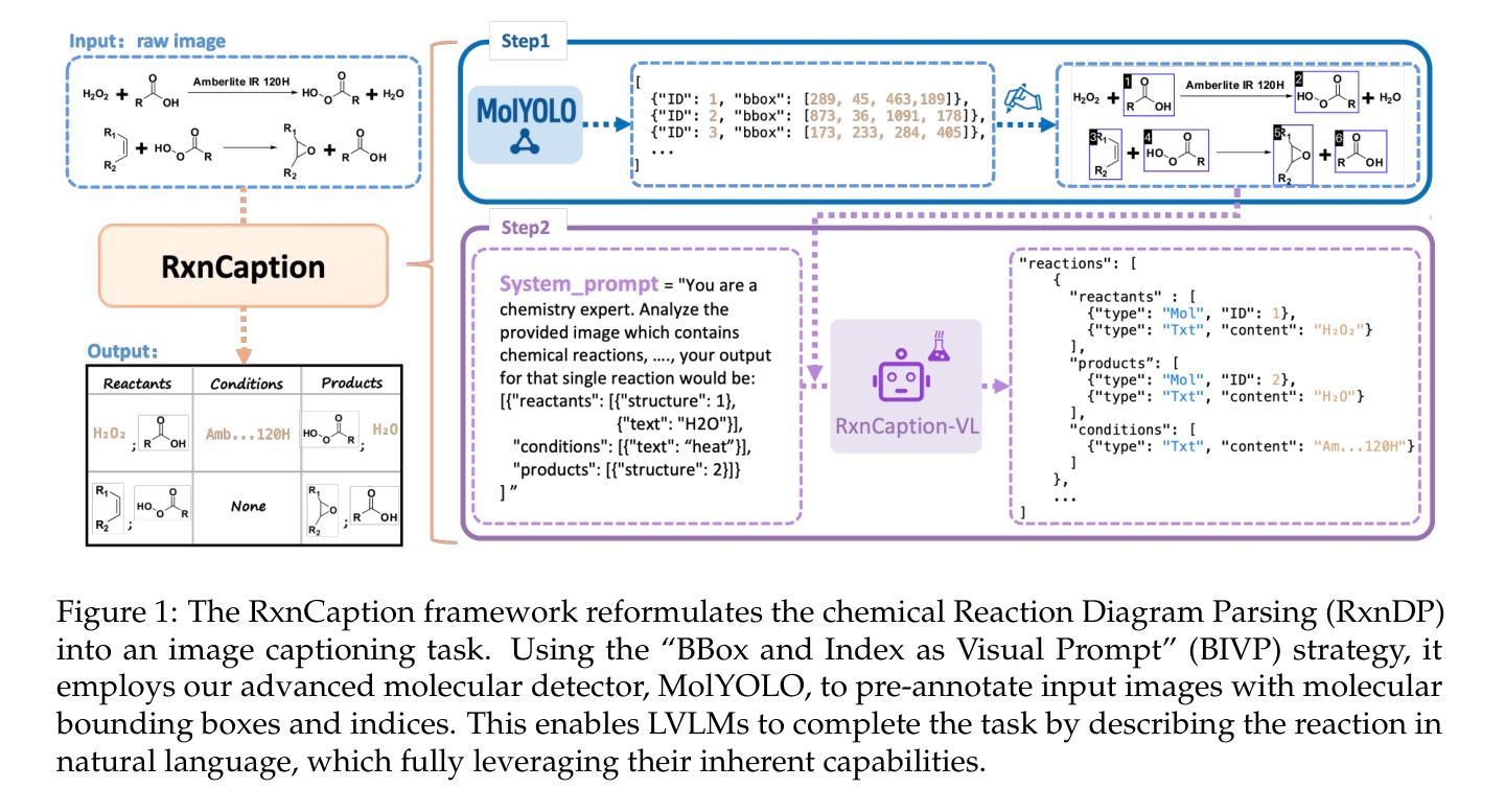 大规模化学反应数据集对化学人工智能研究至关重要。然而,现有的化学反应数据通常以论文中的图片形式存在,这使得它们无法被机器读取,也无法用于训练机器学习模型。针对这一挑战,我们提出了用于化学反应图解析(RxnDP)任务的RxnCaption框架。我们的框架将传统的坐标预测驱动解析过程重新构建为图像描述问题,这是大型视觉语言模型(LVLM)自然处理的问题。我们引入了一种名为“BBox和索引作为视觉提示”(BIVP)的策略,该策略使用我们最先进的分子检测器MolYOLO,直接在输入图像上预先绘制分子边界框和索引。这将下游解析转化为自然语言描述问题。大量实验表明,BIVP策略在简化模型设计的同时,显著提高了结构提取质量。我们还构建了RxnCaption-11k数据集,其规模比先前的现实世界文献基准测试大一个数量级,并且在四种布局原型中具有平衡的测试子集。实验表明,RxnCaption-VL在多个指标上实现了最先进的性能。我们相信我们的方法、数据集和模型将推动从化学文献中提取结构化信息,并在化学领域的更广泛人工智能应用中发挥作用。我们会在GitHub上发布数据、模型和代码。