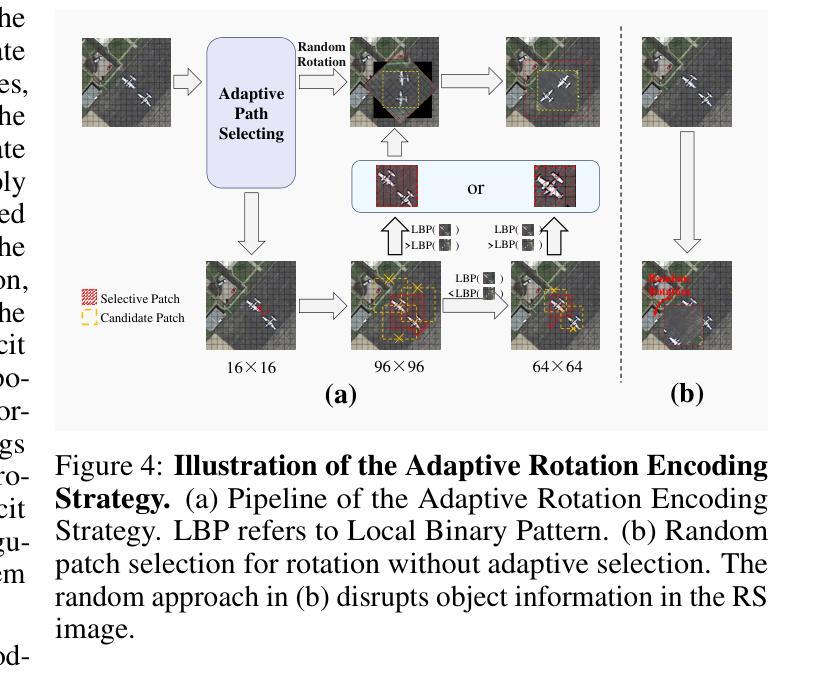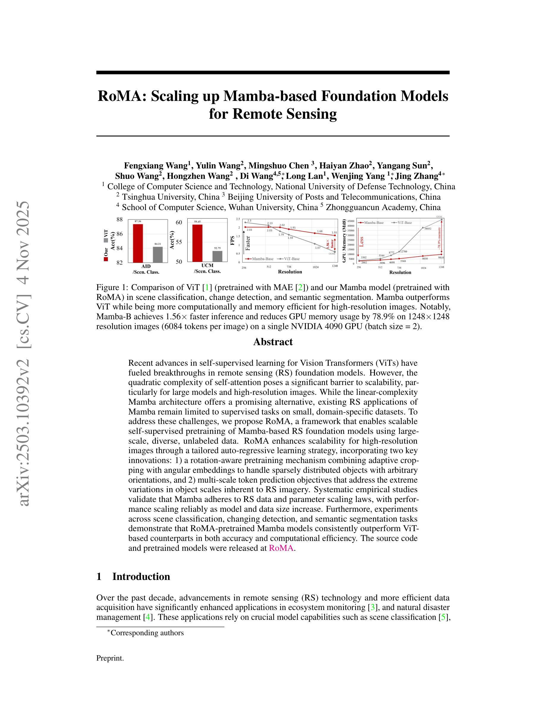 近期自监督学习在Vision Transformer(ViT)方面的进展为遥感(RS)基础模型带来了突破。然而,自注意力的二次复杂度对可扩展性造成了重大障碍,特别是在大型高分辨率图像方面。虽然具有线性复杂度的Mamba架构提供了有前景的替代方案,但现有RS应用仅限于小规模特定域数据集上的监督任务。为解决这些挑战,我们提出RoMA框架,使基于Mamba的RS基础模型能够利用大规模、多样化、无标签数据进行自我监督预训练,实现可扩展性。RoMA通过定制的自回归学习策略增强高分辨率图像的扩展性,包括两项关键创新:一是结合自适应裁剪和角度嵌入的旋转感知预训练机制,以处理具有任意方向的稀疏分布对象;二是多尺度令牌预测目标,解决遥感图像中对象尺度极端变化的问题。实验表明,Mamba符合RS数据和参数扩展定律,随着模型和数据规模的增加,性能可靠地扩展。此外,场景分类、对象检测和语义分割任务的实验显示,RoMA预训练的Mamba模型在准确性和计算效率方面一致优于ViT基础模型。