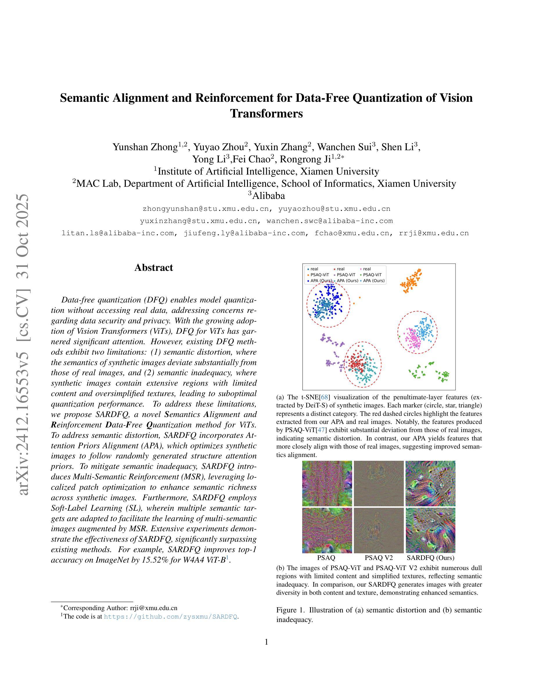 数据无关量化(DFQ)在不接触真实数据的情况下实现模型量化,注重数据安全和隐私保护。针对视觉变压器(ViTs)的DFQ方法面临语义失真和语义不足的问题。为此,提出一种新型的SARDFQ方法,通过注意力优先对齐(APA)解决语义失真问题,并通过多语义增强(MSR)减轻语义不足的问题。SARDFQ采用软标签学习(SL),适应多种语义目标,促进由MSR增强的多语义图像的学习。实验证明SARDFQ效果显著,如W4A4 ViT-B在ImageNet上的top-1准确率提高15.52%。更多信息可通过访问代码库https://github.com/zysxmu/SARDFQ获取。