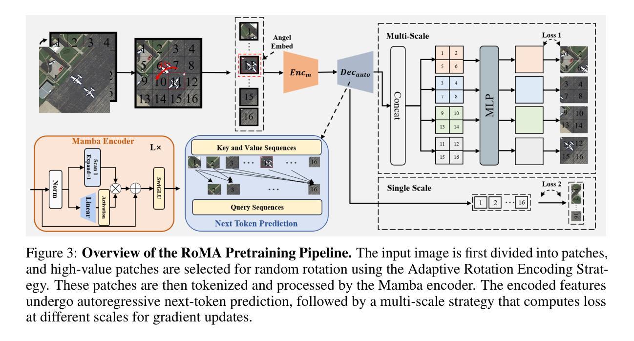 - RoMA通过自回归学习策略处理高分辨率图像,包括旋转感知预训练和多尺度令牌预测目标两项关键创新。