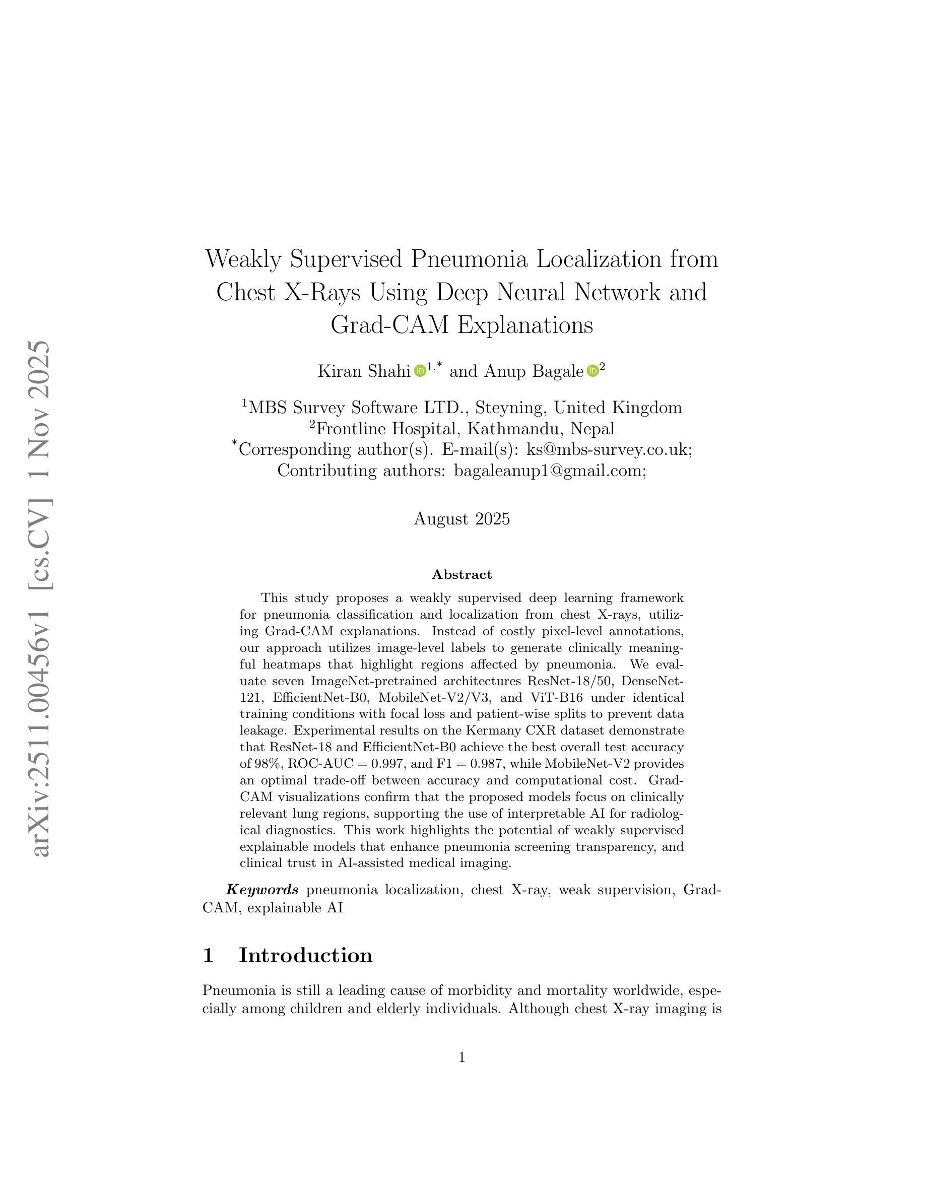 本研究提出了一种利用Grad-CAM解释从胸部X射线图像进行肺炎分类和定位的弱监督深度学习框架。与其他方法不同,我们的方法不需要昂贵的像素级注释,而是利用图像级标签生成具有临床意义的热图,突出显示受肺炎影响的区域。我们在相同的训练条件下评估了ResNet-18/50、DenseNet-121、EfficientNet-B0、MobileNet-V2/V3和ViT-B16七种在ImageNet上预训练的架构,使用焦点损失和患者级分割来防止数据泄露。在Kermany CXR数据集上的实验结果表明,ResNet-18和EfficientNet-B0的最佳总体测试准确率达到了98%,ROC-AUC为0.997,F1为0.987。而MobileNet-V2则在精度和计算成本之间提供了最佳的权衡。Grad-CAM可视化证实,所提出的模型关注临床相关的肺部区域,支持使用可解释的AI进行放射学诊断。这项工作突显了弱监督解释性模型的潜力,可以提高肺炎筛查的透明度以及临床对AI辅助医学成像的信任度。相关研究可通过 https://github.com/kiranshahi/pneumonia-analysis 了解。