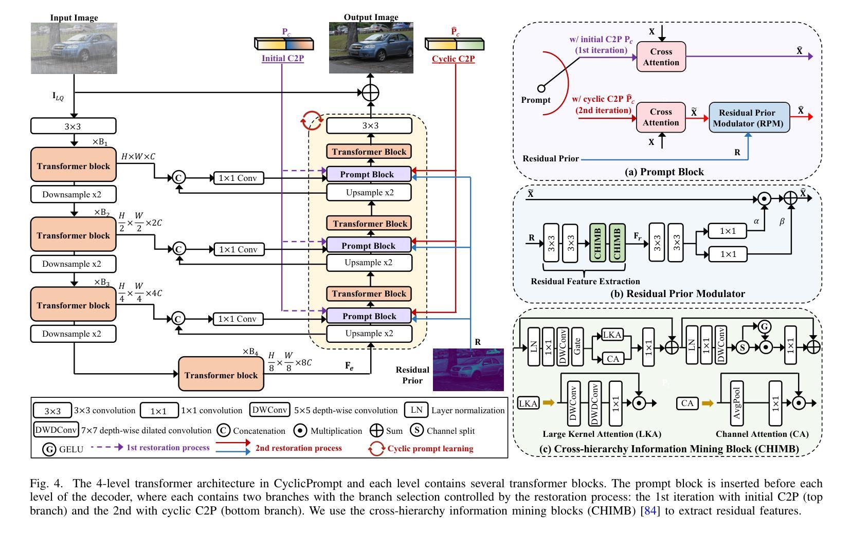 Summary:针对恶劣天气去除问题,提出一种名为CyclicPrompt的循环提示方法,集成天气相关信息和上下文感知表示,通过引导恢复过程,并采用擦除和粘贴机制进一步优化。形成循环的“提示-恢复-提示”管道,充分利用天气特定知识、文本上下文和可靠纹理,在合成和真实世界数据集上表现出卓越性能。