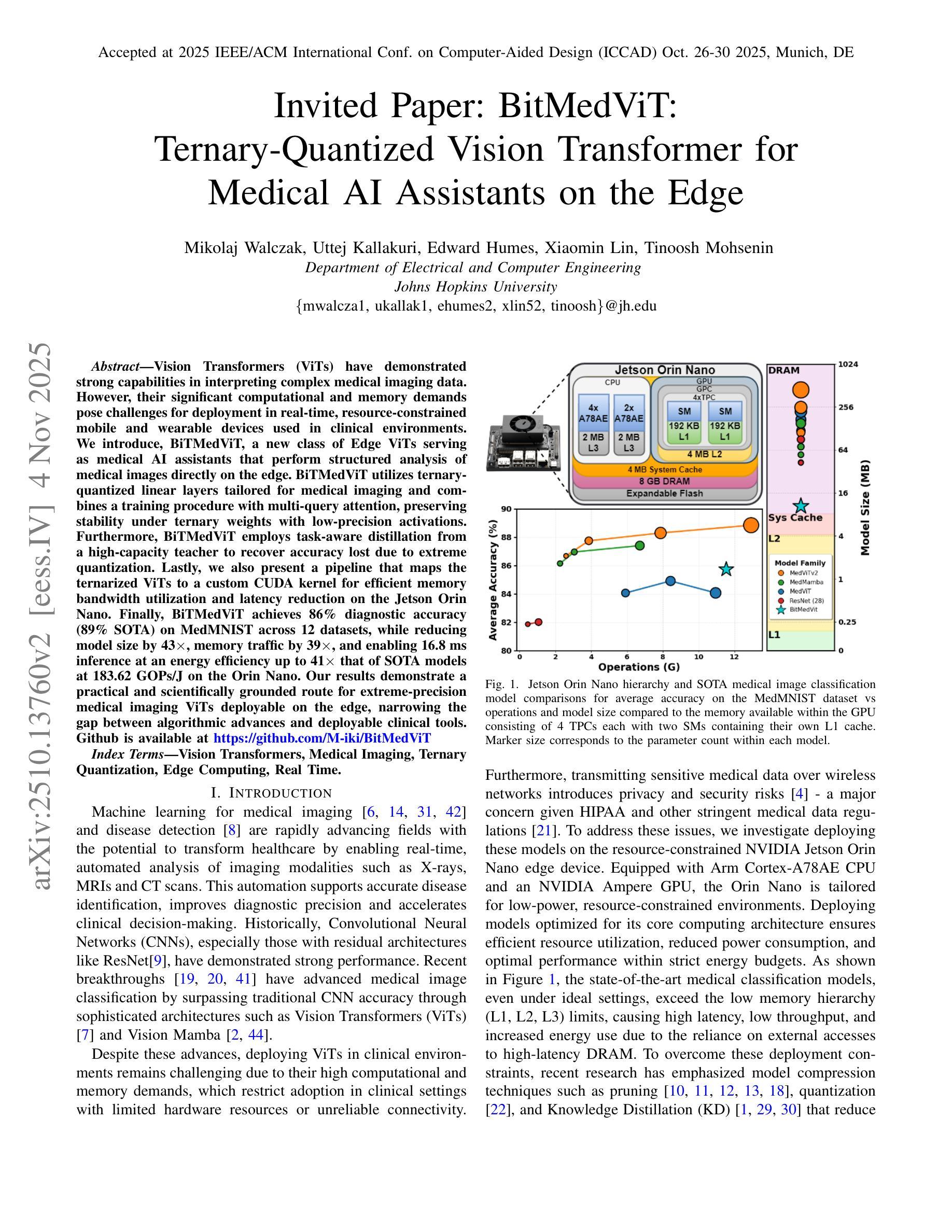 视觉Transformer(ViT)在解读复杂医学成像数据方面表现出强大的能力。然而,其巨大的计算和内存需求为在资源受限的实时移动和可穿戴设备的部署带来了挑战,这些设备在临床环境中被广泛应用。我们引入了BiTMedViT,这是一种新型的边缘ViT,作为医疗人工智能助手,直接在边缘对医疗图像进行结构化分析。BiTMedViT利用针对医学成像定制的三元量化线性层,并结合多查询注意力的训练过程,在三元权重下保持低精度激活的稳定性。此外,BiTMedViT还采用任务感知蒸馏法,从高性能教师模型中恢复因极端量化而损失的准确性。最后,我们还提供了一个将三元ViT映射到自定义CUDA内核的管道,以实现Jetson Orin Nano上的高效内存带宽利用和延迟降低。最终,BiTMedViT在MedMNIST的12个数据集上实现了86%的诊断准确率(最高89%),同时减小了模型大小43倍,减少了内存流量39倍,并在Orin Nano上以183.62 GOPs/J的能效实现了16.8毫秒的推理时间,能效高达现有技术模型的41倍。我们的结果证明了在边缘部署极端精度医疗成像ViT的实际且科学的途径,缩小了算法进步和可部署临床工具之间的差距。
