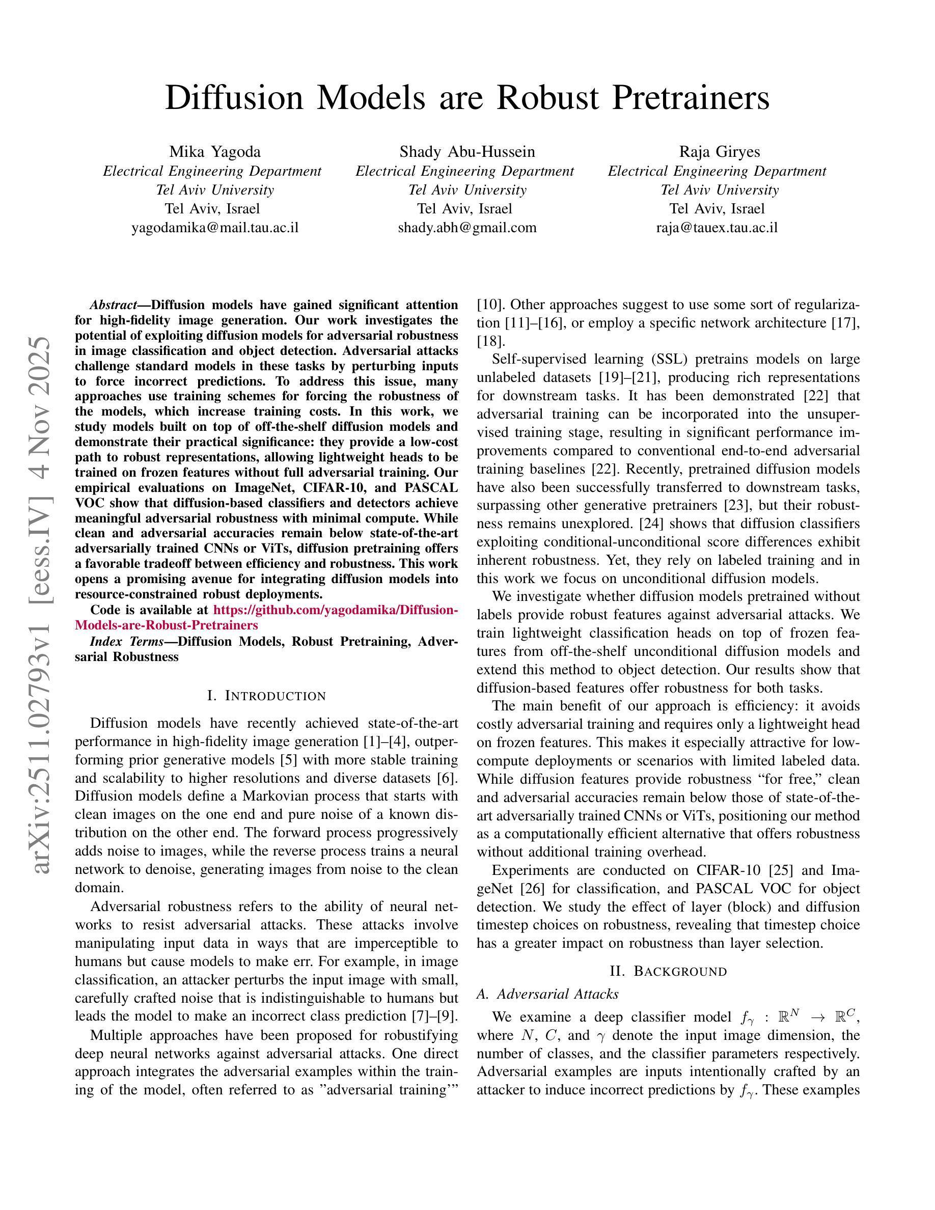 扩散模型在高保真图像生成方面引起了广泛的关注。我们的工作研究了将扩散模型用于图像分类和对象检测中的对抗性稳健性的潜力。对抗性攻击通过扰动输入来迫使模型做出错误预测,从而挑战这些任务的标准模型。为了解决这一问题,许多方法使用训练方案来增强模型的稳健性,这增加了训练成本。在这项工作中,我们研究了基于现成的扩散模型构建的模型,并展示了它们的实际意义:它们为获得稳健表示提供了低成本途径,允许在冻结的特征上训练轻量级头部,而无需进行全面的对抗性训练。我们在ImageNet、CIFAR-10和PASCAL VOC上的经验评估表明,基于扩散的分类器和检测器实现了有意义的对抗性稳健性,计算量最小。虽然干净和对抗性准确性仍然低于最先进的对抗性训练的CNN或ViTs,但扩散预训练在效率和稳健性之间提供了有利的权衡。这项工作为将扩散模型集成到资源受限的稳健部署中打开了有前途的道路。