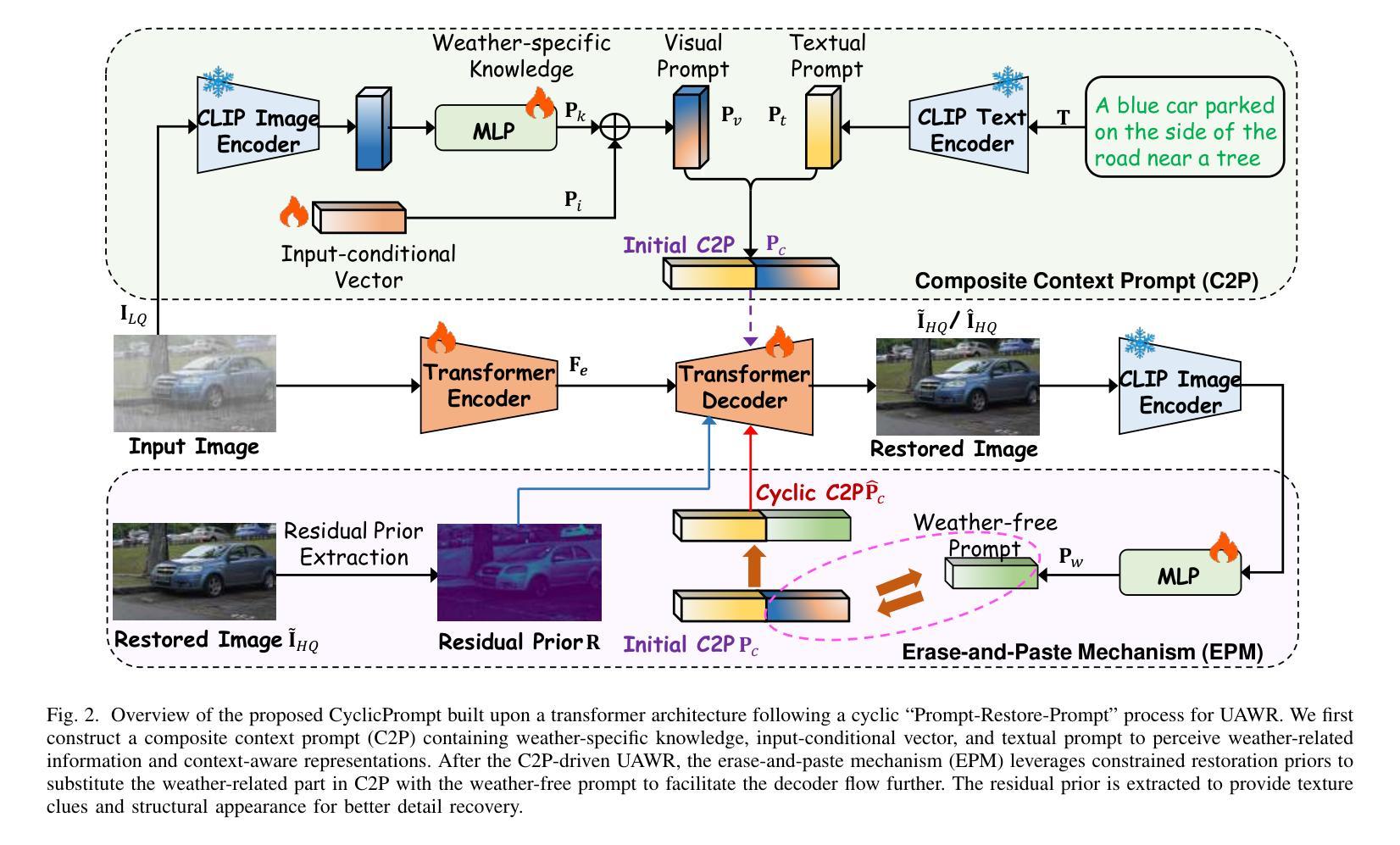 普遍恶劣天气去除(UAWR)旨在在一个统一框架内解决各种天气退化问题。最近的方法受到预训练视觉语言模型(例如CLIP)的提示学习的启发,利用退化感知提示来促进无天气图像恢复,取得了显著的改进。在这项工作中,我们提出了CyclicPrompt,这是一种创新的循环提示方法,旨在提高UAWR的有效性、适应性和通用性。CyclicPrompt包含两个关键组件:1)复合上下文提示,它将天气相关信息和上下文感知表示集成到网络中,以指导恢复。此提示与以前的方法不同,它将可学习的输入条件向量与特定天气知识相结合,从而提高了对各种退化的适应性。2)擦除和粘贴机制,在初始引导恢复之后,用受限制的恢复先验替换特定天气知识,将高质量的无天气概念引入复合提示中,以进一步微调恢复过程。因此,我们可以形成一个循环的“提示-恢复-提示”管道,巧妙地利用特定天气知识、文本上下文和可靠纹理。在合成和真实世界数据集上的大量实验验证了CyclicPrompt的优越性能。代码可用在:https://github.com/RongxinL/CyclicPrompt。(网址翻译可能不精确,建议查阅对应中文网站)