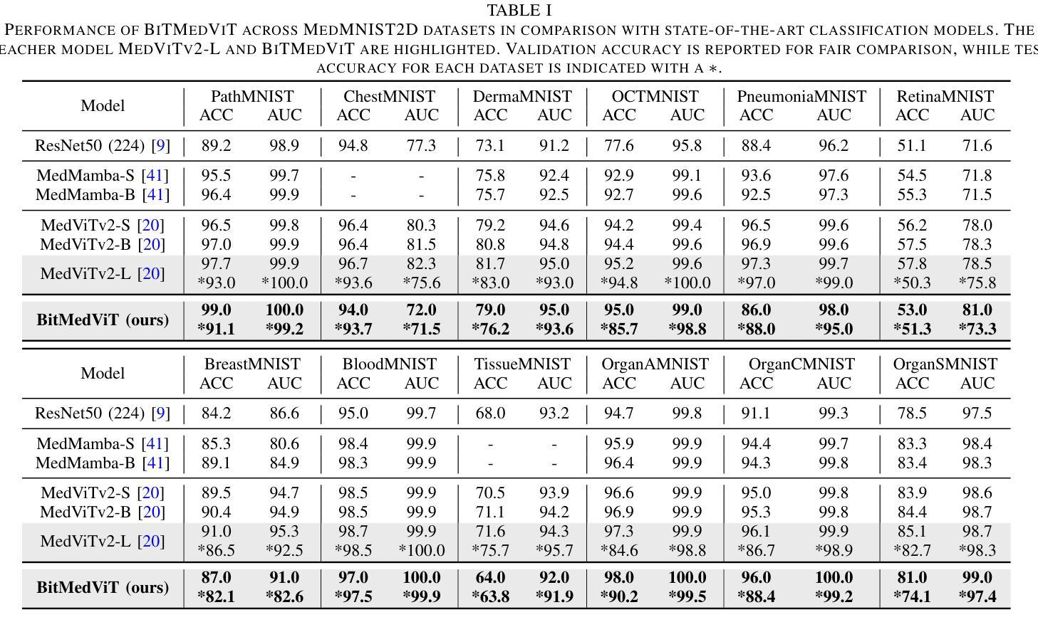 - BiTMedViT在多个数据集上实现了高诊断准确率,同时显著减少了模型大小、内存流量和推理时间。
