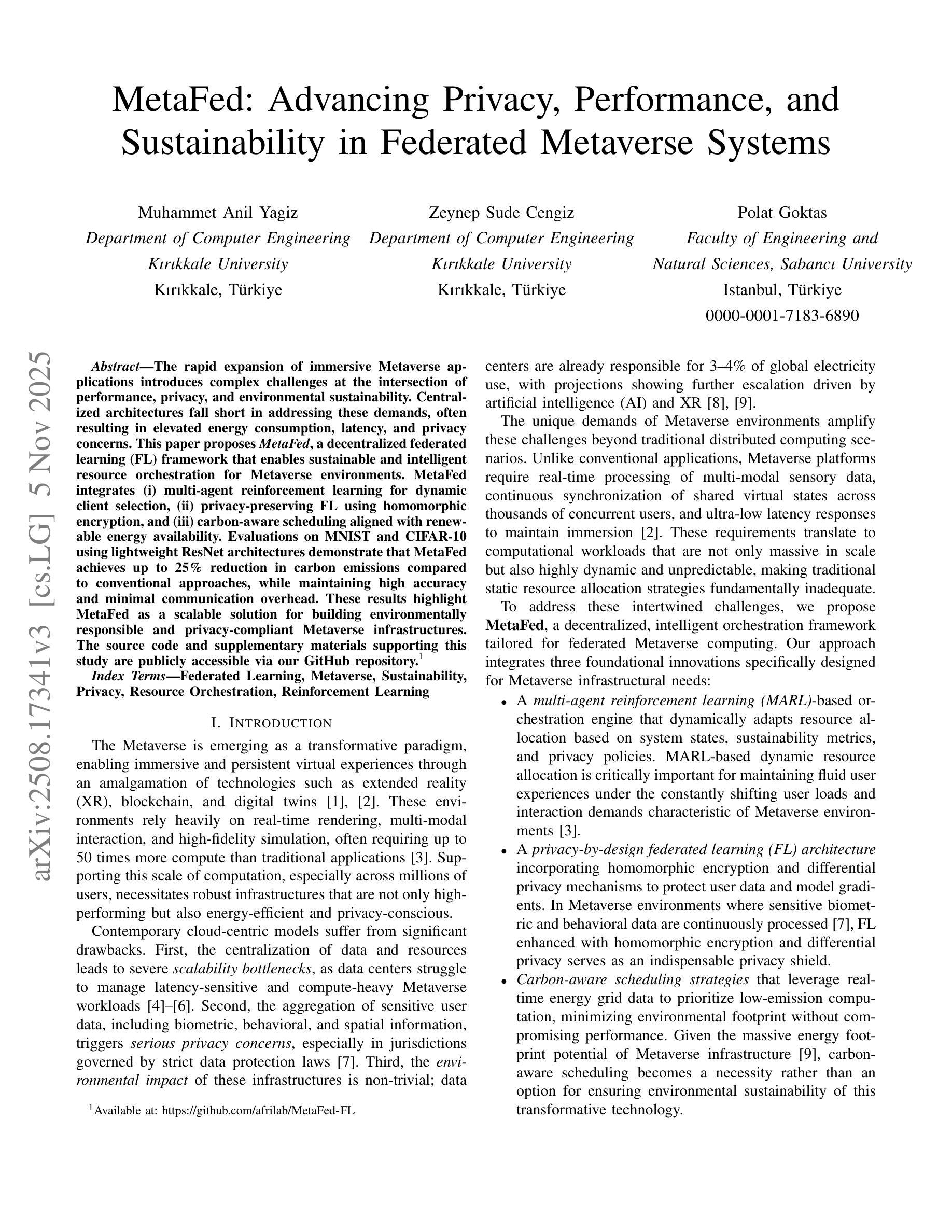 沉浸式元宇宙应用的快速扩展在性能、隐私和环境可持续性交汇处带来了复杂的挑战。集中式架构在应对这些需求时显得力不从心,常常导致能耗增加、延迟和隐私担忧。本文针对元宇宙环境提出了一种可持续的智能资源编排的分布式联邦学习(FL)框架MetaFed。MetaFed集成了(i)用于动态客户端选择的多智能体强化学习,(ii)使用同态加密的隐私保护联邦学习,以及(iii)与可再生能源可用性相对应的碳感知调度。在MNIST和CIFAR-10上使用轻量级ResNet架构的评估表明,与传统方法相比,MetaFed实现了高达25%的碳排放减少,同时保持了高准确性和最小的通信开销。这些结果凸显了MetaFed在构建环保和符合隐私的元宇宙基础设施方面的可扩展解决方案。