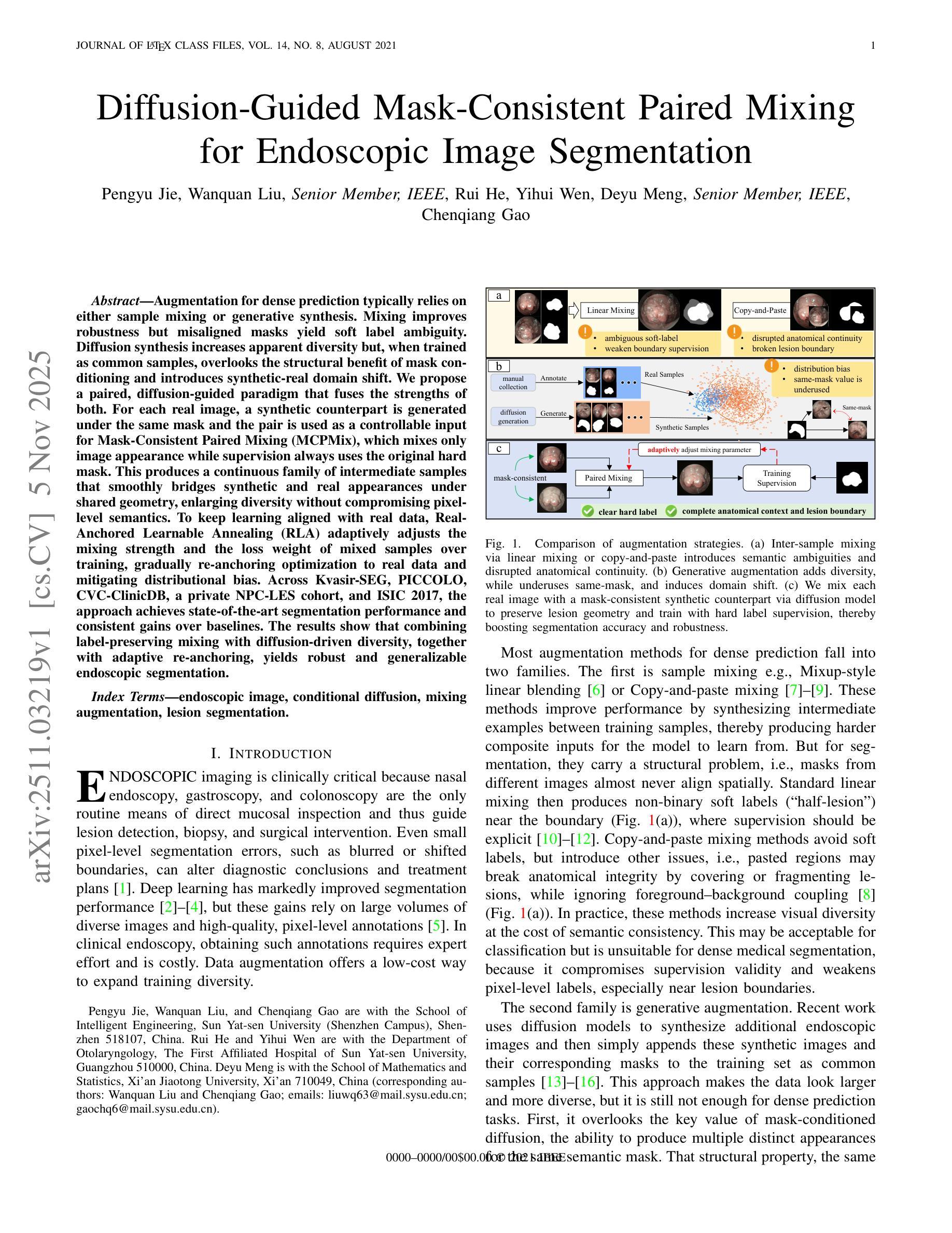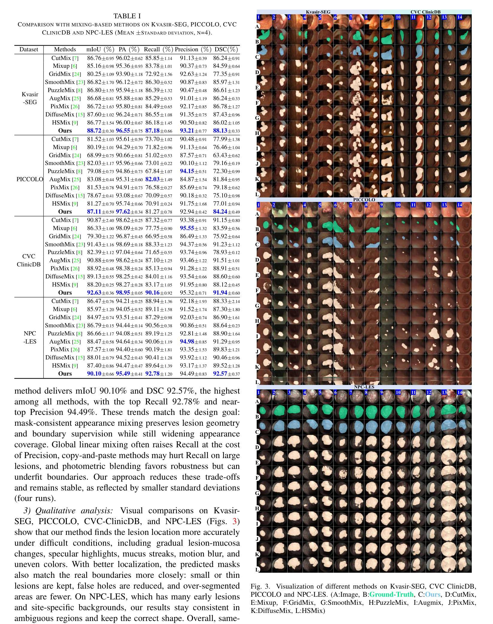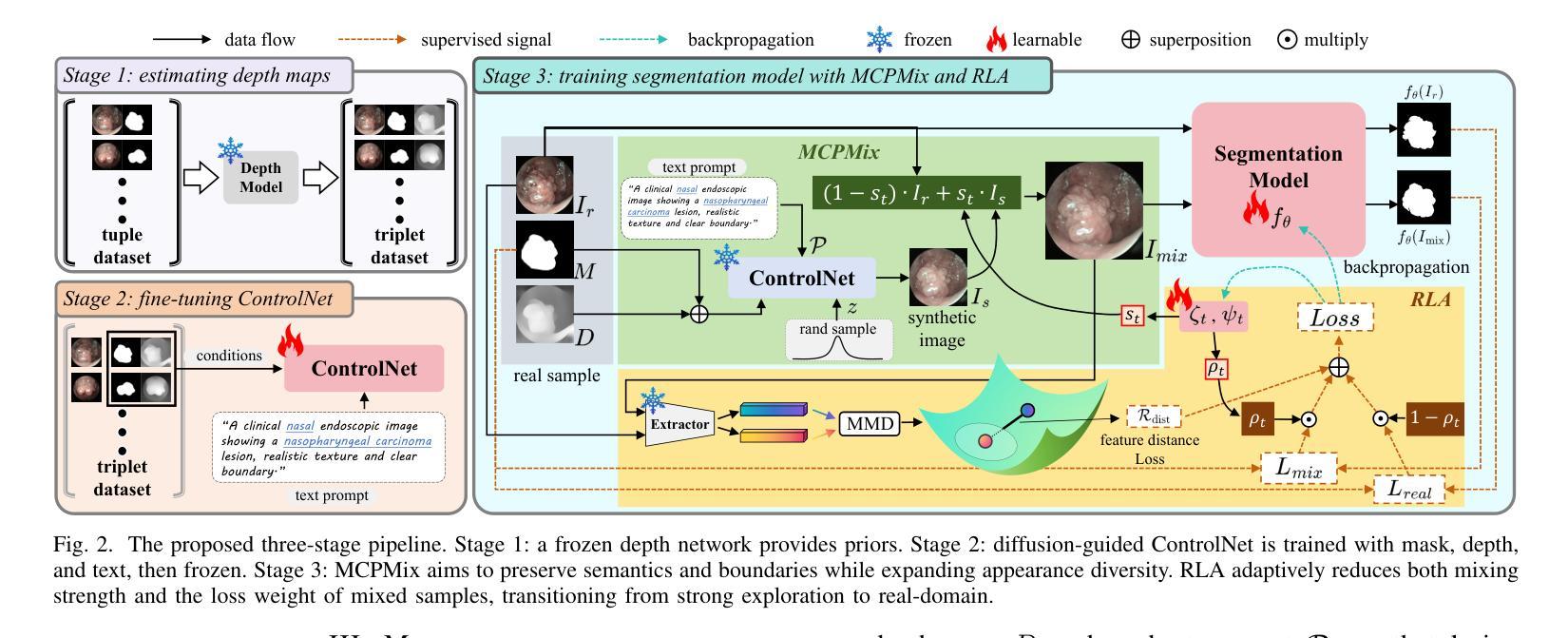 数据增强对于密集预测通常依赖于样本混合或生成合成。混合提高了稳健性,但错位掩膜会导致软标签歧义。扩散合成增加了明显的多样性,但当作为常规样本进行训练时,它忽略了掩膜条件的结构性优势,并引入了合成-真实域偏移。我们提出了一种配对、扩散引导的范式,融合了两者的优点。对于每个真实图像,在相同掩膜下生成一个合成对应物,并且该对用作可控输入,用于掩膜一致配对混合(MCPMix),其中仅混合图像外观,而监督始终使用原始的硬掩膜。这产生了一系列中间样本,这些样本在共享几何结构下平滑地桥接了合成和真实外观,扩大了多样性,同时不损害像素级语义。为了保持学习与真实数据对齐,Real-Anchored Learnable Annealing(RLA)自适应地调整混合强度和混合样本的损失权重,逐步将优化重新锚定到真实数据,并减轻分布偏见。在Kvasir-SEG、PICCOLO、CVC-ClinicDB、私人NPC-LES队列和ISIC 2017中,该方法达到了最先进的分割性能,并在基准测试上实现了一致的收益。结果表明,将标签保留混合与扩散驱动多样性相结合,再加上自适应重新锚定,可实现稳健且可推广的内镜分割。