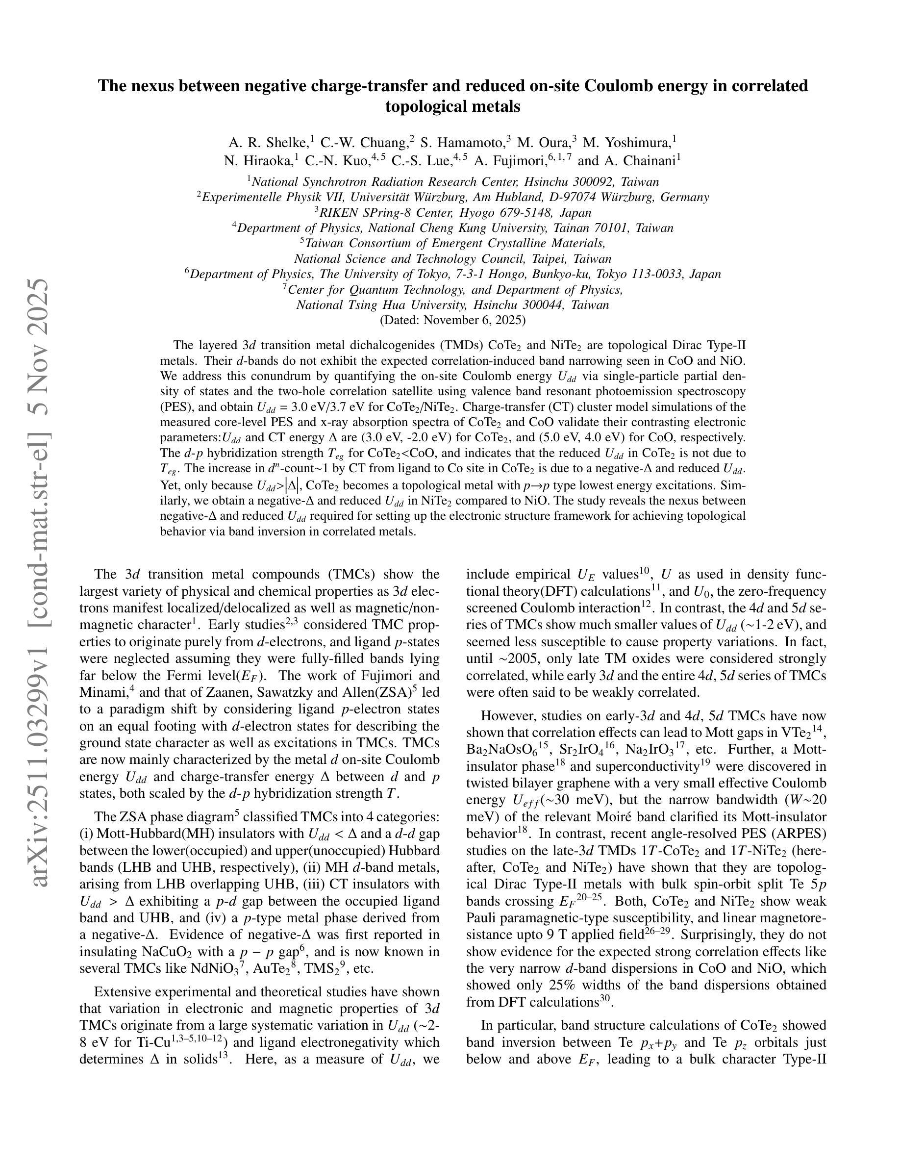 钴和镍的二元过渡金属硫化物(TMDs)CoTe2和NiTe2是拓扑狄拉克第二类金属。它们呈现出不同于氧化钴和氧化镍的d带特性。通过测量部分态密度和两孔关联卫星的库仑能Ud,发现CoTe2和NiTe2的Ud分别为3.0 eV和3.7 eV。基于电荷转移模型对CoTe2和CoO的核心能级光电子发射光谱和X射线吸收光谱的模拟,验证了其不同的电子参数,揭示了对比鲜明的电子结构和拓扑行为的内在关联。研究指出,负电荷转移能量Δ和降低的Ud是实现拓扑金属的关键。