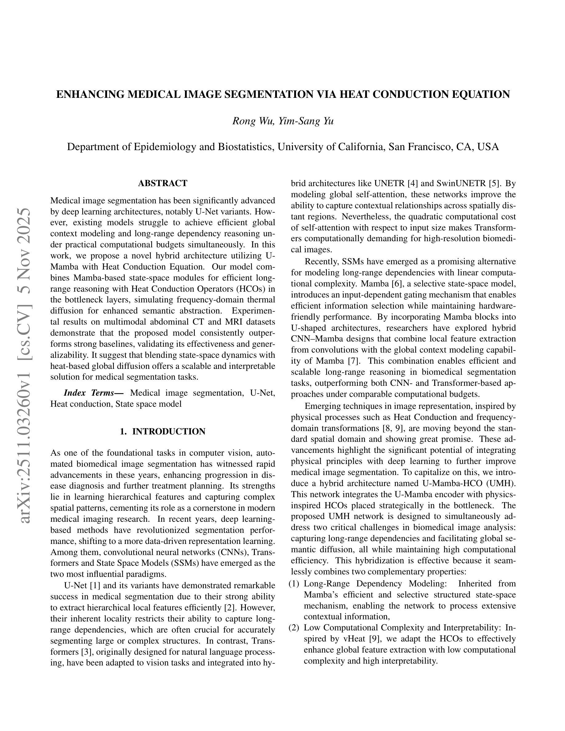 医学图像分割领域,深度学习架构特别是U-Net变体已取得显著进展。然而,现有模型在有限的计算预算下难以实现高效的全局上下文建模和长距离依赖推理。本研究提出了一种新型混合架构U-Mamba与热传导方程结合的方法。该方法结合了基于Mamba的状态空间模块进行高效的长距离推理,并在瓶颈层引入热传导算子(HCOs),模拟频域热扩散以增强语义抽象。在多模态腹部CT和MRI数据集上的实验结果表明,该方法在强基线基础上表现优异,验证了其有效性和通用性。这表明结合状态空间动力学与基于热的全局扩散为医学分割任务提供了可扩展且可解释的解决方案。