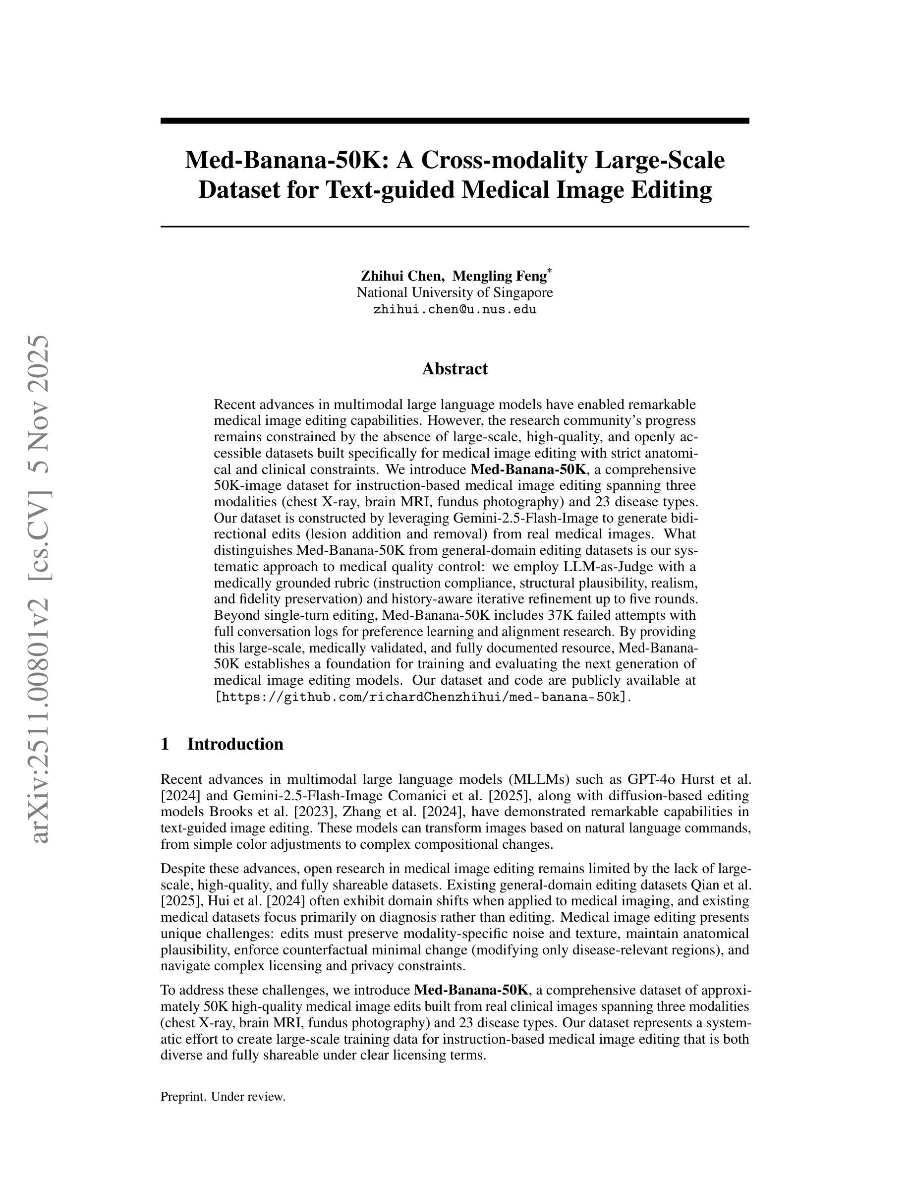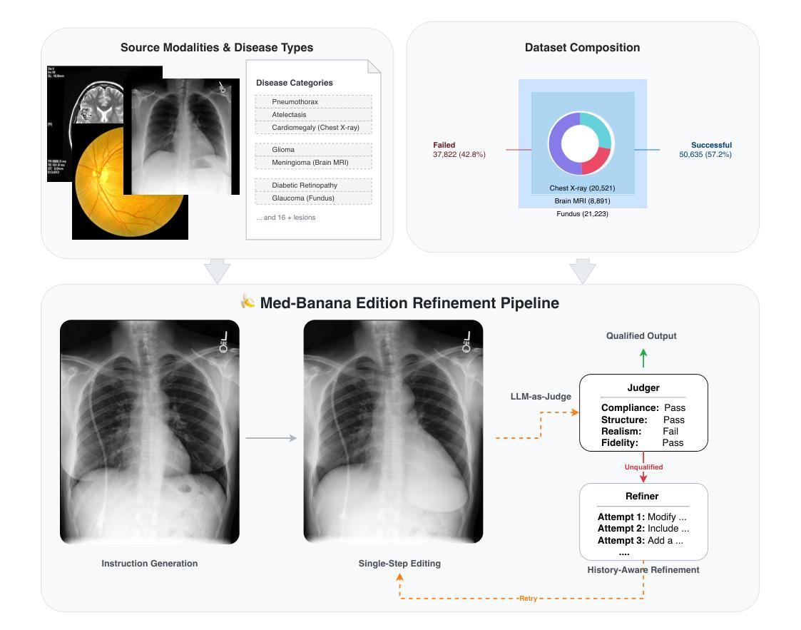 Recent advances in multimodal large language models have enabled remarkable medical image editing capabilities. However, the research community’s progress remains constrained by the absence of large-scale, high-quality, and openly accessible datasets built specifically for medical image editing with strict anatomical and clinical constraints. We introduce Med-Banana-50K, a comprehensive 50K-image dataset for instruction-based medical image editing spanning three modalities (chest X-ray, brain MRI, fundus photography) and 23 disease types. Our dataset is constructed by leveraging Gemini-2.5-Flash-Image to generate bidirectional edits (lesion addition and removal) from real medical images. What distinguishes Med-Banana-50K from general-domain editing datasets is our systematic approach to medical quality control: we employ LLM-as-Judge with a medically grounded rubric (instruction compliance, structural plausibility, realism, and fidelity preservation) and history-aware iterative refinement up to five rounds. Beyond single-turn editing, Med-Banana-50K includes 37K failed attempts with full conversation logs for preference learning and alignment research. By providing this large-scale, medically validated, and fully documented resource, Med-Banana-50K establishes a foundation for training and evaluating the next generation of medical image editing models.Our dataset and code are publicly available at [https://github.com/richardChenzhihui/med-banana-50k].