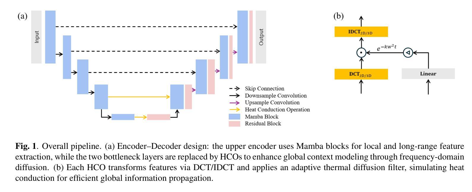 - 状态空间模块用于高效长距离推理,而热传导算子模拟频域热扩散以增强语义抽象。