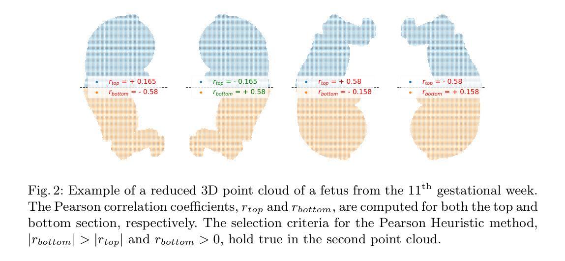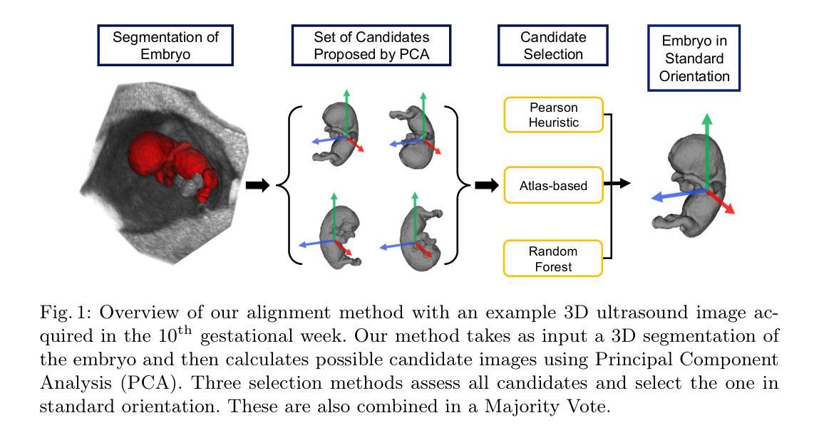 在三维超声波图像中标准化胚胎对齐,有助于提高产前生长监测中的标准平面检测、地标可视化和不同扫描间的差异识别。本研究提出了一种自动化方法进行标准化对齐。通过应用主成分分析(PCA)于胚胎分割掩膜,提取胚胎的主轴,推导出四个候选方向。选择标准方向候选者采用三种策略之一:基于皮尔逊相关性的启发式评估形状、通过归一化互相关进行图像与图谱的匹配以及随机森林分类器。在Rotterdam Periconceptional Cohort的1043例妊娠的2166张纵向采集的三维超声扫描图像上进行测试,结果证实PCA在99.0%的图像中正确提取了胚胎的主轴。皮尔逊启发式、图谱匹配和随机森林分类器分别在97.4%、95.8%和98.4%的图像中选择了正确的候选者。这些方法的大多数投票表决准确率为98.5%。该流程的高准确性实现了孕早期胚胎的一致性对齐,在临床和研究环境中可实现大规模分析。代码公开可访问:https://gitlab.com/radiology/prenatal-image-analysis/pca-3d-alignment。