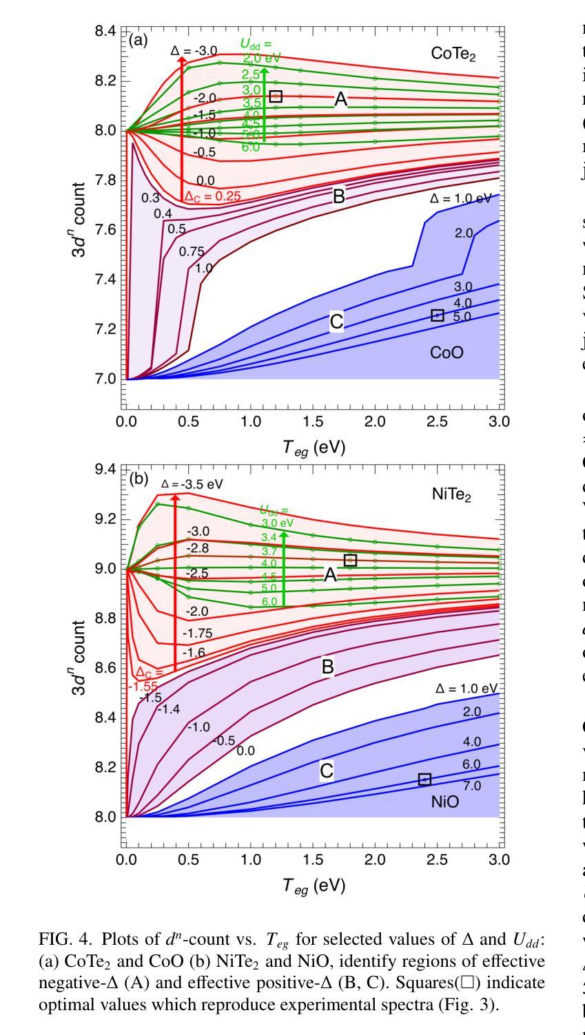 - 从配体到钴位的电荷转移导致d^n计数增加约1,这是由负Δ和降低的Ud引起的。然而,只有Ud大于Δ时,CoTe2才能成为拓扑金属。