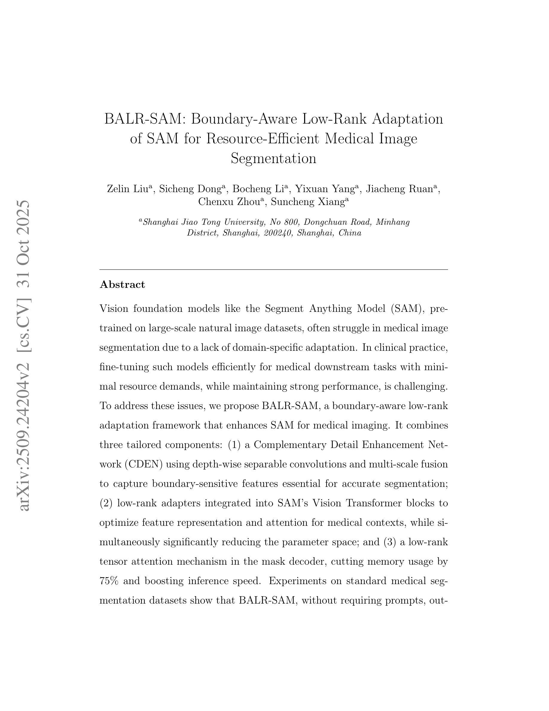 大型自然图像数据集预训练的Segment Anything Model(SAM)在医学图像分割方面存在领域特定适应性问题。为解决此挑战,提出BALR-SAM,一个边界感知的低秩适应框架,增强SAM在医学成像中的性能。包含三个定制组件:CDEN捕捉边界敏感特征,低秩适配器优化特征表示和注意力,低秩张量注意力机制减少内存使用并加快推理速度。在标准医学分割数据集上的实验显示,BALR-SAM仅更新少量参数即可超越先进方法。