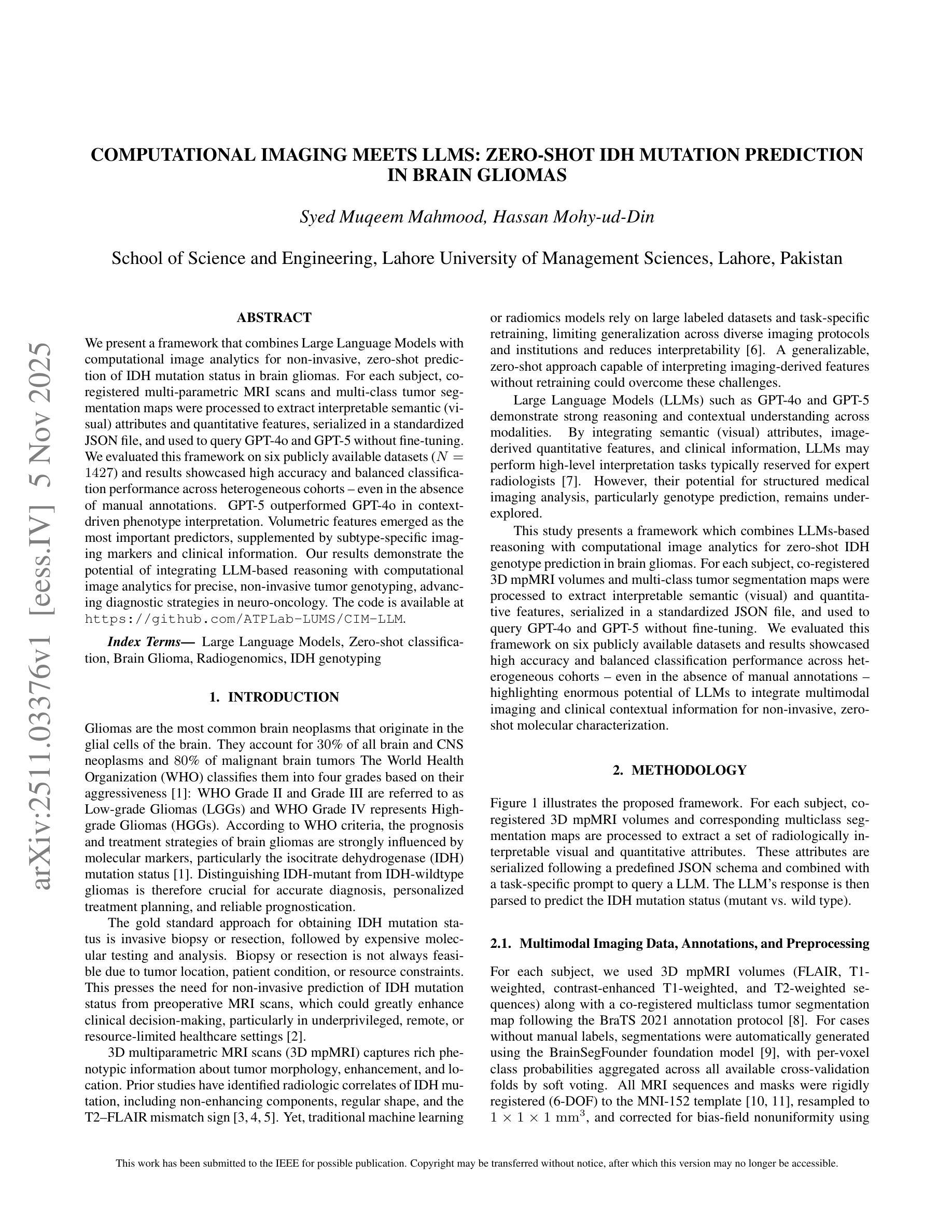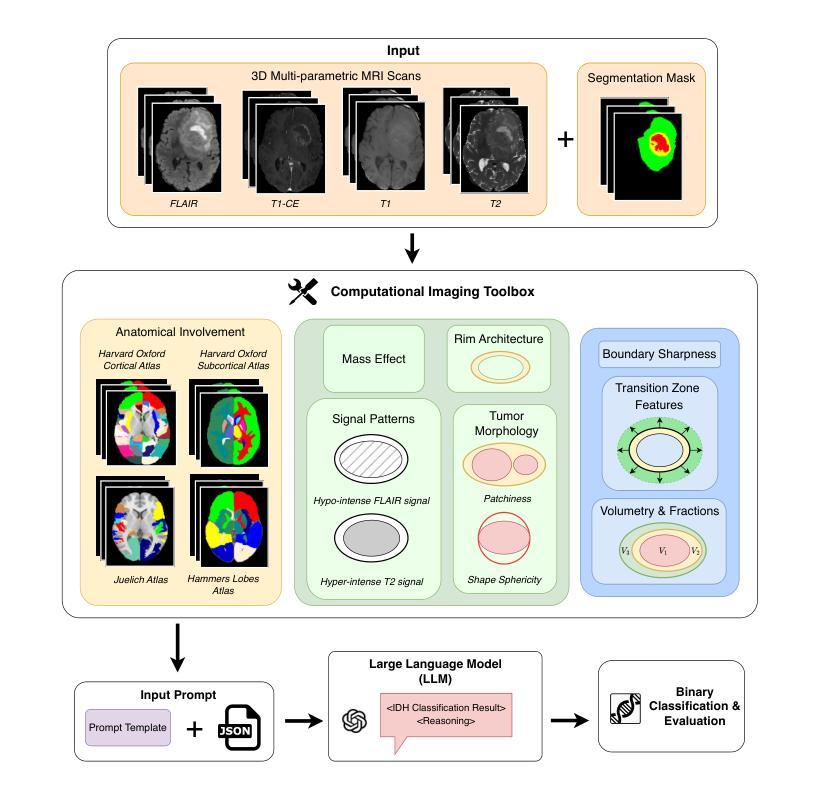 本研究提出了一种结合大型语言模型和计算图像分析的非侵入性零样本预测脑胶质瘤IDH突变状态的方法。通过对每位患者的多参数MRI扫描和多类肿瘤分割图进行核心注册处理,提取可解释的语义(视觉)特征和定量特征,并序列化存储在标准化JSON文件中,用于查询GPT 4o和GPT 5模型而无需微调。在六个公开数据集(N = 1427)上评估该框架,结果显示其具有较高的准确性和跨不同群体的平衡分类性能,即使在无需手动注释的情况下也是如此。GPT 5在上下文驱动的表型解释方面优于GPT 4o。体积特征是最重要预测因素,辅以特定亚型的成像标记和临床信息。本研究结果展示了将大型语言模型推理与计算图像分析相结合在精确非侵入性肿瘤基因分型方面的潜力,为神经肿瘤学的诊断策略提供了进步。相关代码已发布在https://github.com/ATPLab-LUMS/CIM-LLM上。