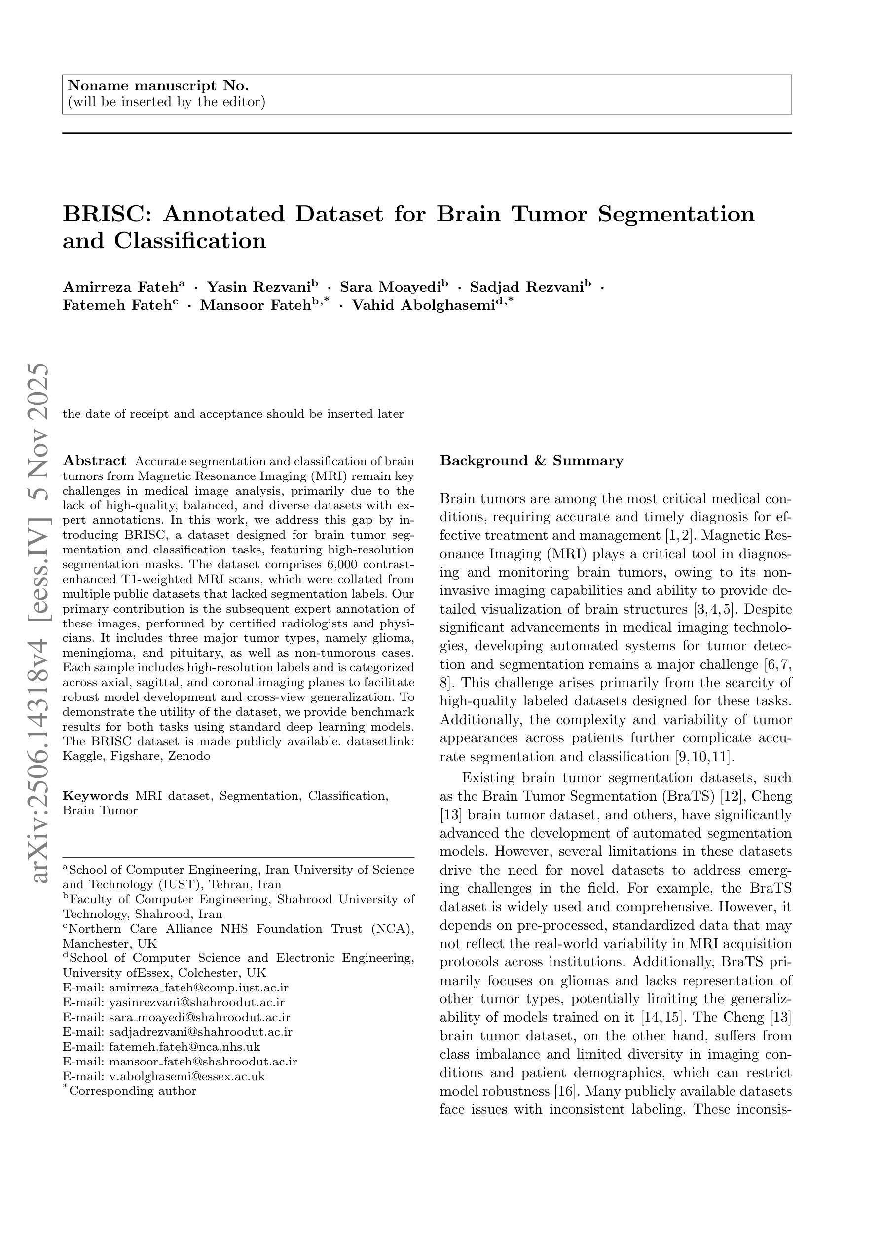从磁共振成像(MRI)对脑肿瘤进行精确分割和分类,在医学图像分析领域仍是关键挑战,这主要是因为缺乏带有专家注释的高质量、均衡和多样化的数据集。在这项工作中,我们通过引入BRISC数据集来解决这一差距,该数据集专为脑肿瘤分割和分类任务设计,具有高质量分辨率分割掩膜。该数据集包含6000张增强型T1加权MRI扫描图像,这些图像是从多个缺少分割标签的公开数据集中整理的。我们的主要贡献是对这些图像进行了随后的专家注释,这些注释由认证过的放射学家和医生完成。它包含三种主要的肿瘤类型,即胶质瘤、脑膜瘤和垂体瘤,以及非肿瘤病例。每个样本都包含高分辨率的标签,并按轴向、矢状和冠状成像平面进行分类,以促进稳健的模型开发和跨视图推广。为了证明数据集的有效性,我们使用标准深度学习模型为两个任务提供了基准测试结果。BRISC数据集已公开发布。数据集链接:Kaggle(https://www.kaggle.com/datasets/briscdataset/brisc2025/)、Figshare(https://doi.org/10.6084/m9.figshare.30533120)、Zenodo(https://doi.org/10.5281/zenodo.17524350)
