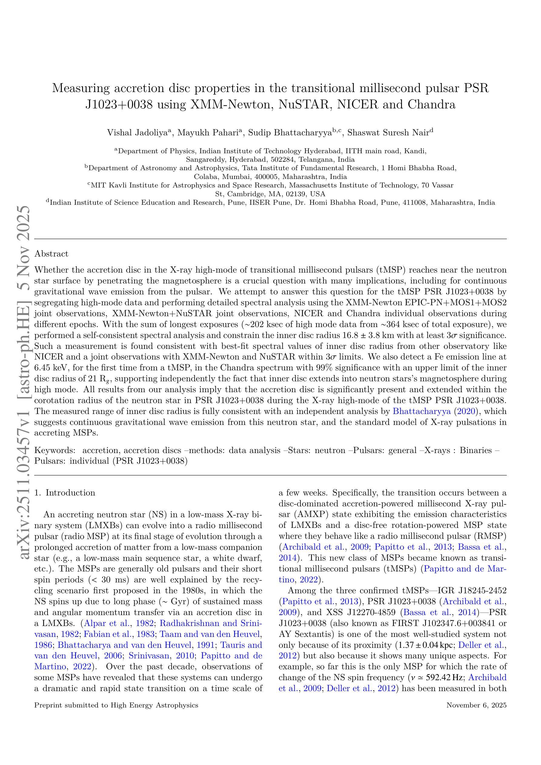 关于过渡型毫秒脉冲星(tMSP)X射线高模式下的吸积盘是否通过穿透磁层而接近中子星表面这一问题具有许多重要意义,包括对脉冲星连续引力波发射的影响。我们尝试通过对tMSP PSR J1023+0038的高模式数据进行分割,并利用XMM-Newton EPIC-PN+MOS1+MOS2联合观测、XMM-Newton+NuSTAR联合观测以及在不同时期NICER和Chandra的单独观测结果,进行详细的光谱分析来回答这个问题。通过对最长曝光时间的累加(约202 ksec的高模式数据,总计约364 ksec的曝光时间),我们进行了自洽的光谱分析,以至少3σ的显著性将内盘半径约束为16.8±3.8公里。这样的测量值与NICER等其他观测站的最佳拟合光谱内盘半径值相符,并与XMM-Newton和NuSTAR联合观测的3σ限制内的值一致。我们还首次在来自tMSP的Chandra光谱中检测到Fe发射线(以99%的显著性),内盘半径的上限为21 Rg,独立支持在高模式下内盘延伸至中子星磁层的事实。我们分析的所有结果都暗示,在PSR J1023+0038的X射线高模式下,其吸积盘明显存在于中子星的协同转动半径范围内。所测得的内盘半径范围与Bhattacharyya(2020)的独立分析完全一致,表明该中子星存在连续的引力波发射,并且符合吸积MSPs的X射线脉动标准模型。