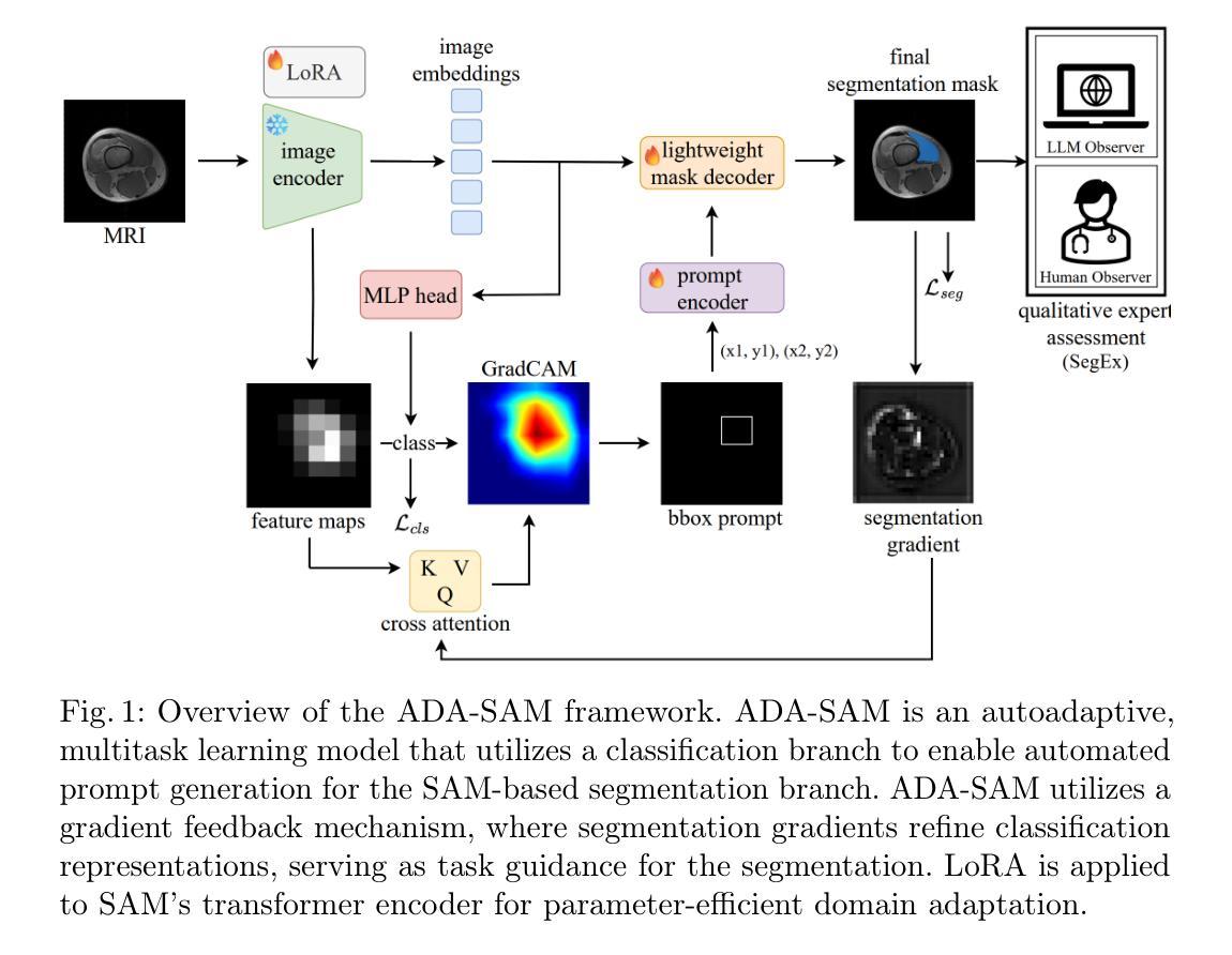 医学图像分割是成像工作流程中的关键任务,影响许多基于图像的决定。传统全监督分割模型依赖于大量手动标注的训练数据,这一过程既昂贵又耗时,且容易出错。因此,需要准确、自动、标注效率高的模型训练方法。我们提出ADA-SAM(自动、特定领域、自适应分割任何模型),这是一种基于Segment Anything(SAM)框架的新型多任务学习框架,用于医学图像分割。它利用辅助分类器的类激活图来指导半监督分割分支的预测,并引入了一种新颖的梯度反馈机制,通过分割梯度来指导和改进分类预测,从而在分割和分类分支之间建立可学习的连接。我们在康复试验期间收集的真实世界临床数据上验证了ADA-SAM,结果表明,在有限标签条件下,所提出的方法在全监督和半监督基准测试上的表现均超出两位数。