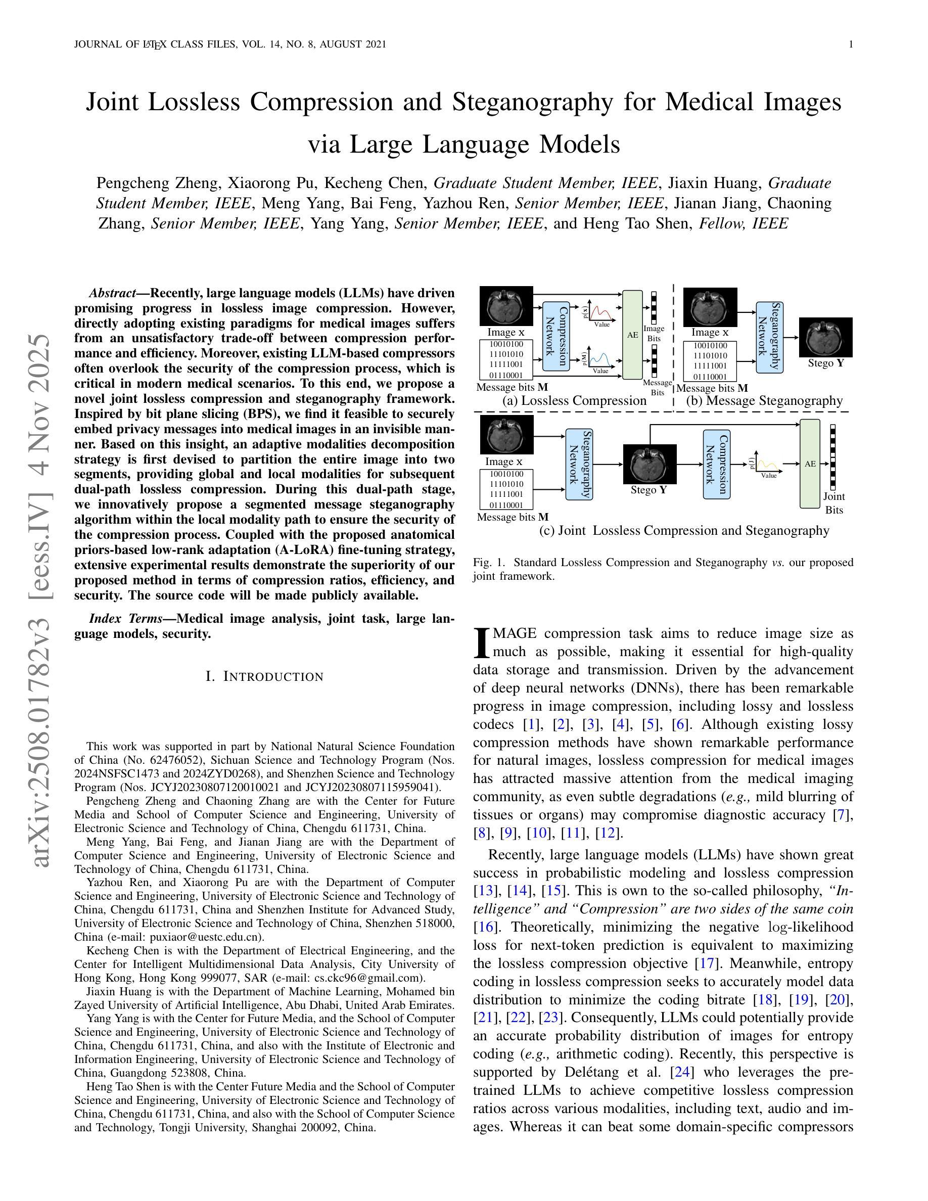 最近,大型语言模型(LLM)在无损图像压缩方面取得了令人瞩目的进展。然而,直接采用现有的医学图像范例在压缩性能和效率之间往往面临令人不满意的权衡。此外,现有的基于LLM的压缩器往往忽视了压缩过程的安全性,这在现代医疗场景中至关重要。为此,我们提出了一种新颖的无损压缩与隐写术联合框架。受位平面切片(BPS)的启发,我们发现可以将隐私信息以不可见的方式嵌入医学图像中。基于此见解,我们首先设计了一种自适应模态分解策略,将整个图像分为两部分,为随后的双路径无损压缩提供全局和局部模态。在这一双路径阶段,我们在局部模态路径中创新地提出了一种分段消息隐写算法,以确保压缩过程的安全性。结合提出的基于解剖先验的低秩自适应(A-LoRA)微调策略,大量实验结果证明了我们方法在压缩比、效率和安全性方面的优越性。源代码将公开提供。